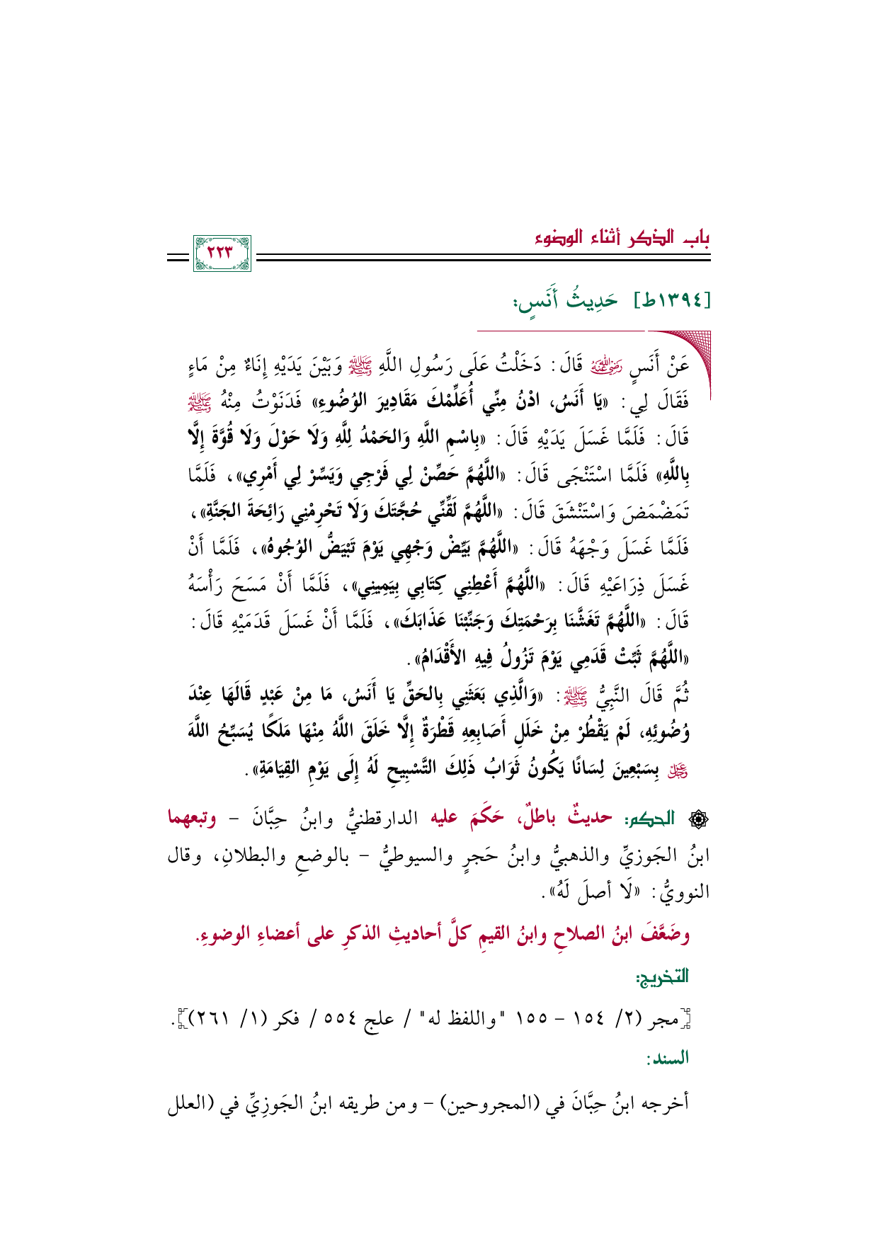 ◼ عَنْ أَنَسٍ رضي الله عنه قَالَ: دَخَلْتُ عَلَى رَسُولِ اللَّهِ صلى الله عليه وسلم وَبَيْنَ يَدَيْهِ إِنَاءٌ مِنْ مَاءٍ فَقَالَ لِي: «يَا أَنَسُ، ادْنُ مِنِّي أُعَلِّمْكَ مَقَادِيرَ الوُضُوءِ» فَدَنَوْتُ مِنْهُ صلى الله عليه وسلم قَالَ: فَلَمَّا غَسَلَ يَدَيْهِ قَالَ: «بِاسْمِ اللَّهِ وَالحَمْدُ لِلَّهِ وَلَا حَوْلَ وَلَا قُوَّةَ إِلَّا بِاللَّهِ» فَلَمَّا اسْتَنْجَى قَالَ: «اللَّهُمَّ حَصِّنْ لِي فَرْجِي وَيَسِّرْ لِي أَمْرِي»، فَلَمَّا تَمَضْمَضَ وَاسْتَنْشَقَ قَالَ: «اللَّهُمَّ لَقِّنِّي حُجَّتَكَ وَلَا تَحْرِمْنِي رَائِحَةَ الجَنَّةِ»، فَلَمَّا غَسَلَ وَجْهَهُ قَالَ: «اللَّهُمَّ بَيِّضْ وَجْهِي يَوْمَ تَبْيَضُّ الوُجُوهُ»، فَلَمَّا أَنْ غَسَلَ ذِرَاعَيْهِ قَالَ: «اللَّهُمَّ أَعْطِنِي كِتَابِي بِيَمِينِي»، فَلَمَّا أَنْ مَسَحَ رَأْسَهُ قَالَ: «اللَّهُمَّ تَغَشَّنَا بِرَحْمَتِكَ وَجَنِّبْنَا عَذَابَكَ»، فَلَمَّا أَنْ غَسَلَ قَدَمَيْهِ قَالَ: «اللَّهُمَّ ثَبِّتْ قَدَمِي يَوْمَ تَزُولُ فِيهِ الأَقْدَامُ».