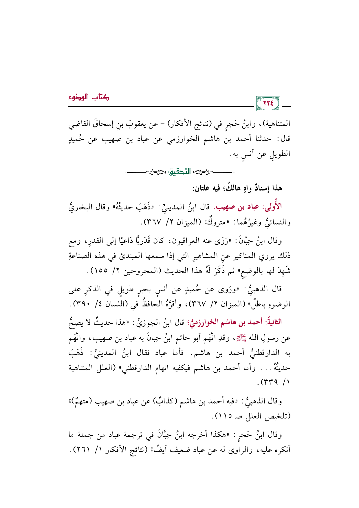 الأُولى: عباد بن صهيب. قال ابنُ المدينيِّ: "ذَهَبَ حديثُهُ" وقال البخاريُّ والنسائيُّ وغيرُهُما: "متروكٌ" (الميزان ٢/ ٣٦٧).