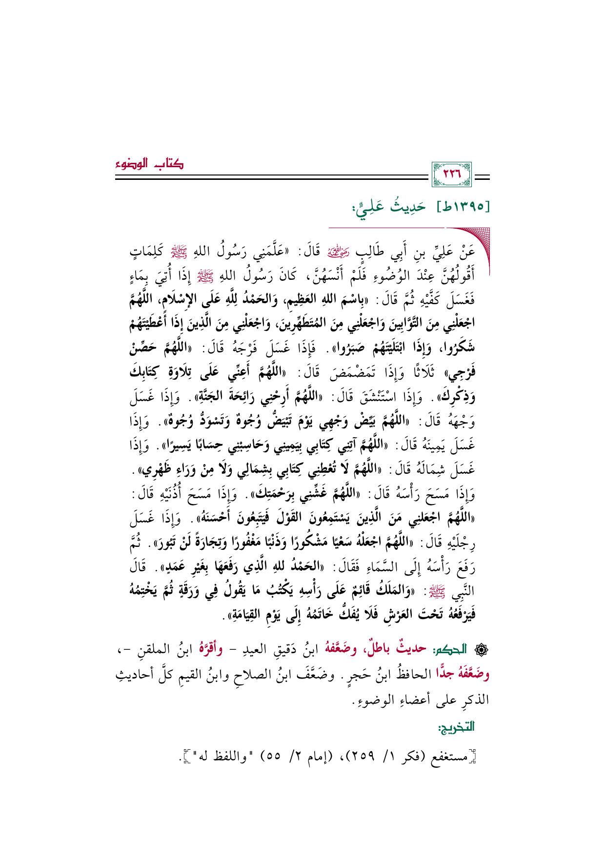[الحكم]: حديثٌ باطلٌ، وضَعَّفهُ ابنُ دَقيقِ العيدِ -وأقرَّهُ ابنُ الملقنِ-، وضَعَّفَهُ جدًّا الحافظُ ابنُ حَجرٍ. وضَعَّفَ ابنُ الصلاحِ وابنُ القيمِ كلَّ أحاديثِ الذكرِ على أعضاءِ الوضوءِ.
