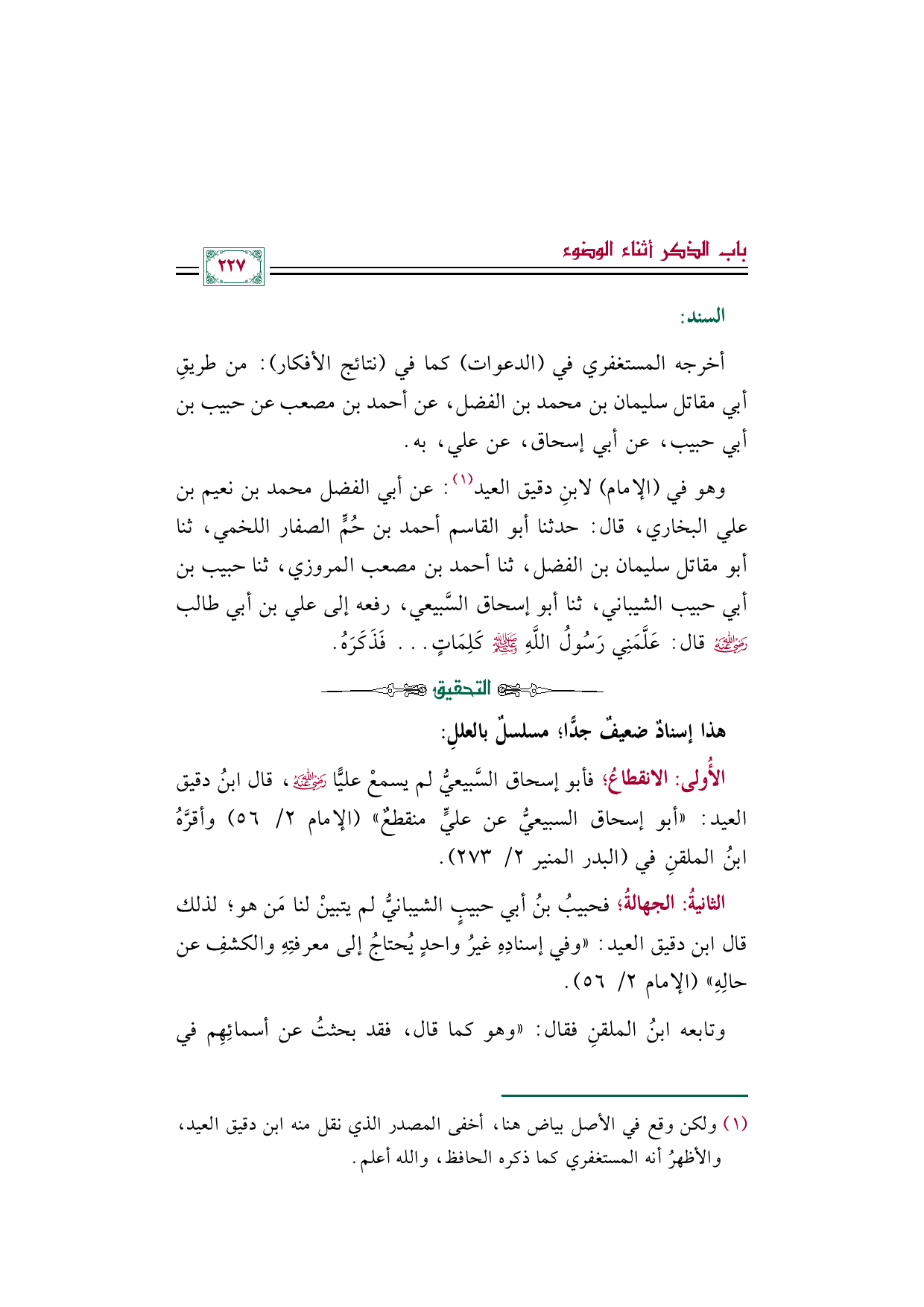 الأُولى: الانقطاعُ؛ فأبو إسحاق السَّبيعيُّ لم يسمعْ عليًّا رضي الله عنه، قال ابنُ دقيق العيد: "أبو إسحاق السبيعيُّ عن عليٍّ منقطعٌ" (الإمام ٢/ ٥٦) وأقرَّهُ ابنُ الملقنِ في (البدر المنير ٢/ ٢٧٣).