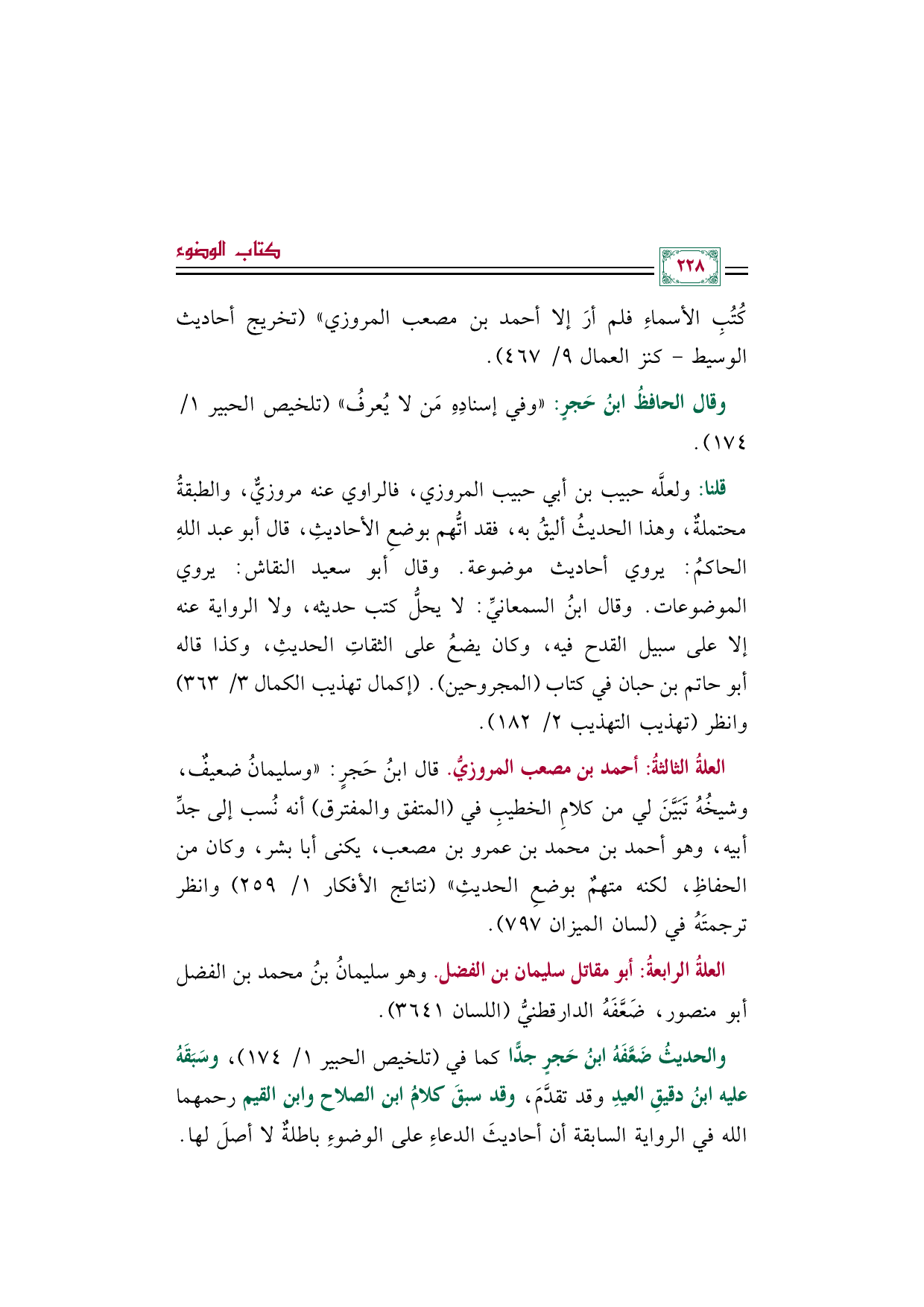 العلةُ الرابعةُ: أبو مقاتل سليمان بن الفضل. وهو سليمانُ بنُ محمد بن الفضل أبو منصور، ضَعَّفَهُ الدارقطنيُّ (اللسان ٣٦٤١).
