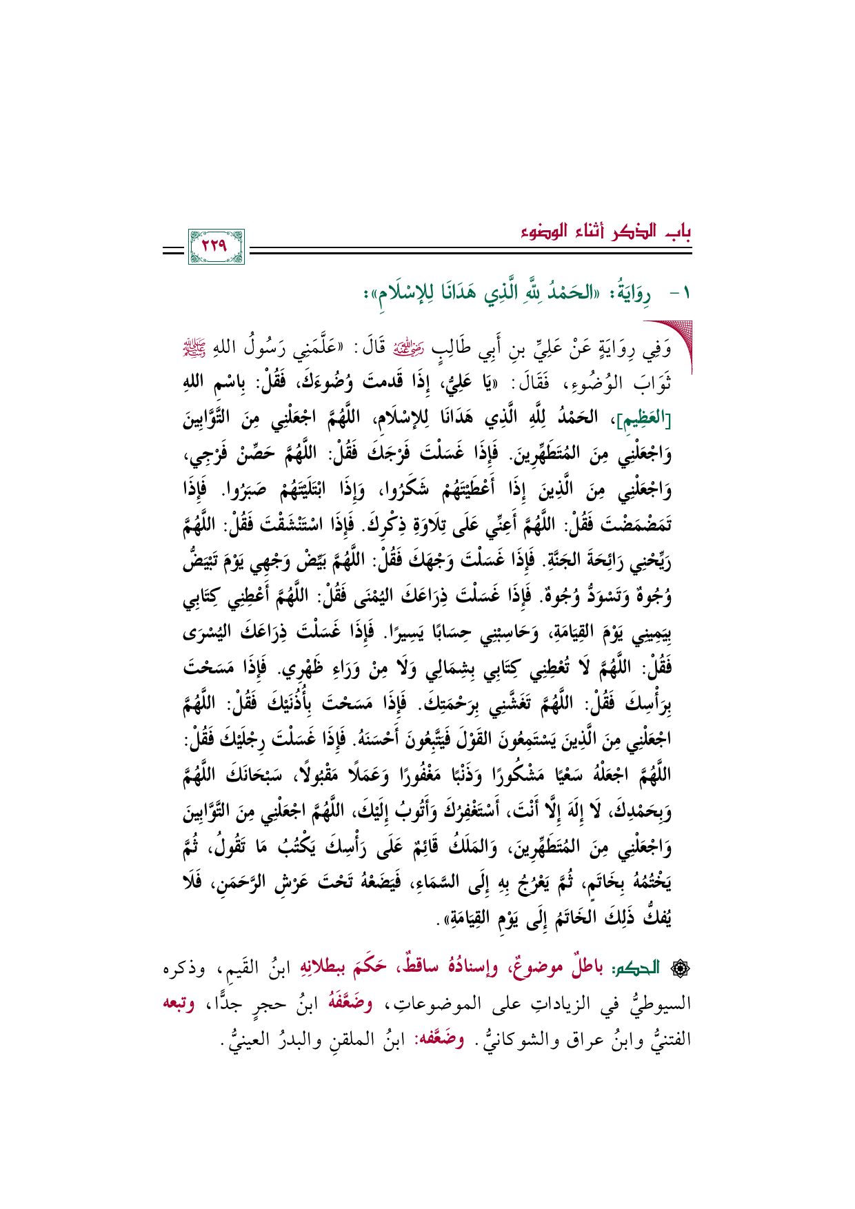 • وَفِي رِوَايَةٍ عَنْ عَلِيِّ بنِ أَبِي طَالِبٍ رضي الله عنه قَالَ: «عَلَّمَنِي رَسُولُ اللهِ صلى الله عليه وسلم ثَوَابَ الوُضُوءِ، فَقَالَ: «يَا عَلِيُّ، إِذَا قَدمتَ وُضُوءَكَ، فَقُلْ: بِاسْمِ اللهِ [العَظِيمِ]، الحَمْدُ لِلَّهِ الَّذِي هَدَانَا لِلإسْلَامِ، اللَّهُمَّ اجْعَلْنِي مِنَ التَّوَّابِينَ وَاجْعَلْنِي مِنَ المُتَطَهِّرِينَ. فَإِذَا غَسَلْتَ فَرْجَكَ فَقُلْ: اللَّهُمَّ حَصِّنْ فَرْجِي، وَاجْعَلْنِي مِنَ الَّذِينَ إِذَا أَعْطَيْتَهُمْ شَكَرُوا، وَإِذَا ابْتَلَيْتَهُمْ صَبَرُوا. فَإِذَا تَمَضْمَضْتَ فَقُلْ: اللَّهُمَّ أَعِنِّي عَلَى تِلَاوَةِ ذِكْرِكَ. فَإِذَا اسْتَنْشَقْتَ فَقُلْ: اللَّهُمَّ رَيِّحْنِي رَائِحَةَ الجَنَّةِ. فَإِذَا غَسَلْتَ وَجْهَكَ فَقُلْ: اللَّهُمَّ بَيِّضْ وَجْهِي يَوْمَ تَبْيَضُّ وُجُوهٌ وَتَسْوَدُّ وُجُوهٌ. فَإِذَا غَسَلْتَ ذِرَاعَكَ اليُمْنَى فَقُلْ: اللَّهُمَّ أَعْطِنِي كِتَابِي بِيَمِينِي يَوْمَ القِيَامَةِ، وَحَاسِبْنِي حِسَابًا يَسِيرًا. فَإِذَا غَسَلْتَ ذِرَاعَكَ اليُسْرَى فَقُلْ: اللَّهُمَّ لَا تُعْطِنِي كِتَابِي بِشِمَالِي وَلَا مِنْ وَرَاءِ ظَهْرِي. فَإِذَا مَسَحْتَ بِرَأْسِكَ فَقُلْ: اللَّهُمَّ تَغَشَّنِي بِرَحْمَتِكَ. فَإِذَا مَسَحْتَ بِأُذُنَيْكَ فَقُلْ: اللَّهُمَّ اجْعَلْنِي مِنَ الَّذِينَ يَسْتَمِعُونَ القَوْلَ فَيَتَّبِعُونَ أَحْسَنَهُ.