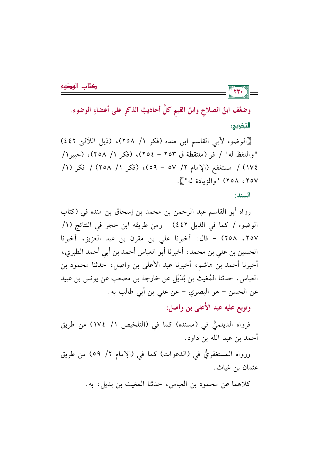رواه أبو القاسم عبد الرحمن بن محمد بن إسحاق بن منده في (كتاب الوضوء/ كما في الذيل ٤٤٢) -ومن طريقه ابن حجر في النتائج (١/ ٢٥٧، ٢٥٨) - قال: أخبرنا علي بن مقرن بن عبد العزيز، أخبرنا الحسين بن علي بن محمد، أخبرنا أبو العباس أحمد بن أبي أحمد الطبري، أخبرنا أحمد بن هاشم، أخبرنا عبد الأعلى بن واصل، حدثنا محمود بن العباس، حدثنا المُغيث بن بُدَيْل عن خارجة بن مصعب عن يونس بن عبيد عن الحسن -هو البصري- عن علي بن أبي طالب به.