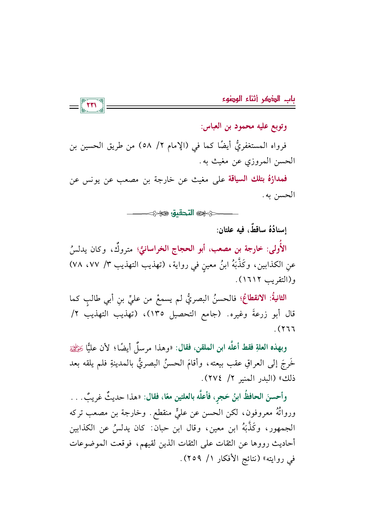 وأحسنَ الحافظُ ابنُ حَجرٍ، فأعلَّه بالعلتين معًا، فقال: "هذا حديثٌ غريبٌ ... ورواتُهُ معروفون، لكن الحسن عن عليٍّ منقطع. وخارجة بن مصعب تركه الجمهور، وكَذَّبَهُ ابن معين، وقال ابن حبان: كان يدلسُ عن الكذابين أحاديث رووها عن الثقات على الثقات الذين لقيهم، فوقعت الموضوعات في روايته" (نتائج الأفكار ١/ ٢٥٩).