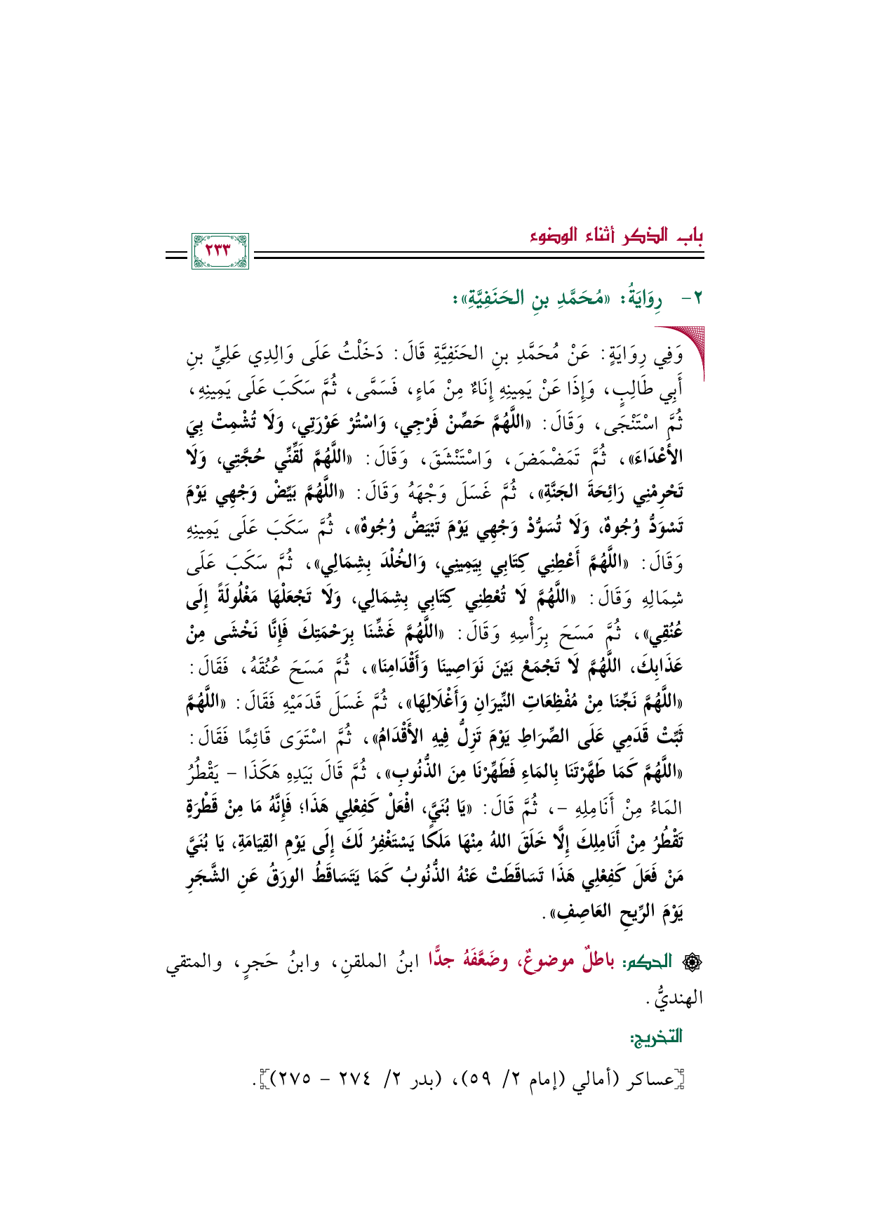 • وَفِي رِوَايَةٍ: عَنْ مُحَمَّدِ بنِ الحَنَفِيَّةِ قَالَ: دَخَلْتُ عَلَى وَالِدِي عَلِيِّ بنِ أَبِي طَالِبٍ، وَإِذَا عَنْ يَمِينِهِ إِنَاءٌ مِنْ مَاءٍ، فَسَمَّى، ثُمَّ سَكَبَ عَلَى يَمِينِهِ، ثُمَّ اسْتَنْجَى، وَقَالَ: «اللَّهُمَّ حَصِّنْ فَرْجِي، وَاسْتُرْ عَوْرَتِي، وَلَا تُشْمِتْ بِيَ الأَعْدَاءَ»، ثُمَّ تَمَضْمَضَ، وَاسْتَنْشَقَ، وَقَالَ: «اللَّهُمَّ لَقِّنِّي حُجَّتِي، وَلَا تَحْرِمْنِي رَائِحَةَ الجَنَّةِ»، ثُمَّ غَسَلَ وَجْهَهُ وَقَالَ: «اللَّهُمَّ بَيِّضْ وَجْهِي يَوْمَ تَسْوَدُّ وُجُوهٌ، وَلَا تُسَوُّدْ وَجْهِي يَوْمَ تَبْيَضُّ وُجُوهٌ»، ثُمَّ سَكَبَ عَلَى يَمِينِهِ وَقَالَ: «اللَّهُمَّ أَعْطِنِي كِتَابِي بِيَمِينِي، وَالخُلْدَ بِشِمَالِي»، ثُمَّ سَكَبَ عَلَى شِمَالِهِ وَقَالَ: «اللَّهُمَّ لَا تُعْطِنِي كِتَابِي بِشِمَالِي، وَلَا تَجْعَلْهَا مَغْلُولَةً إِلَى عُنُقِي»، ثُمَّ مَسَحَ بِرَأْسِهِ وَقَالَ: «اللَّهُمَّ غَشِّنَا بِرَحْمَتِكَ فَإِنَّا نَخْشَى مِنْ عَذَابِكَ، اللَّهُمَّ لَا تَجْمَعْ بَيْنَ نَوَاصِينَا وَأَقْدَامِنَا»، ثُمَّ مَسَحَ عُنُقَهُ، فَقَالَ: «اللَّهُمَّ نَجِّنَا مِنْ مُفْظِعَاتِ النِّيرَانِ وَأَغْلَالِهَا»، ثُمَّ غَسَلَ قَدَمَيْهِ فَقَالَ: «اللَّهُمَّ ثَبِّتْ قَدَمِي عَلَى الصِّرَاطِ يَوْمَ تَزِلُّ فِيهِ الأَقْدَامُ»، ثُمَّ اسْتَوَى قَائِمًا فَقَالَ: «اللَّهُمَّ كَمَا طَهَّرْتَنَا بِالمَاءِ فَطَهِّرْنَا مِنَ الذُّنُوبِ»، ثُمَّ قَالَ بَيَدِهِ هَكَذَا -يَقْطُرُ المَاءُ مِنْ أَنَامِلِهِ-، ثُمَّ قَالَ: «يَا بُنَيَّ، افْعَلْ كَفِعْلِي هَذَا؛ فَإِنَّهُ مَا مِنْ قَطْرَةٍ تَقْطُرُ مِنْ أَنَامِلِكَ إِلَّا خَلَقَ اللهُ مِنْهَا مَلَكًا يَسْتَغْفِرُ لَكَ إِلَى يَوْمِ القِيَامَةِ، يَا بُنَيَّ مَنْ فَعَلَ كَفِعْلِي هَذَا تَسَاقَطَتْ عَنْهُ الذُّنُوبُ كَمَا