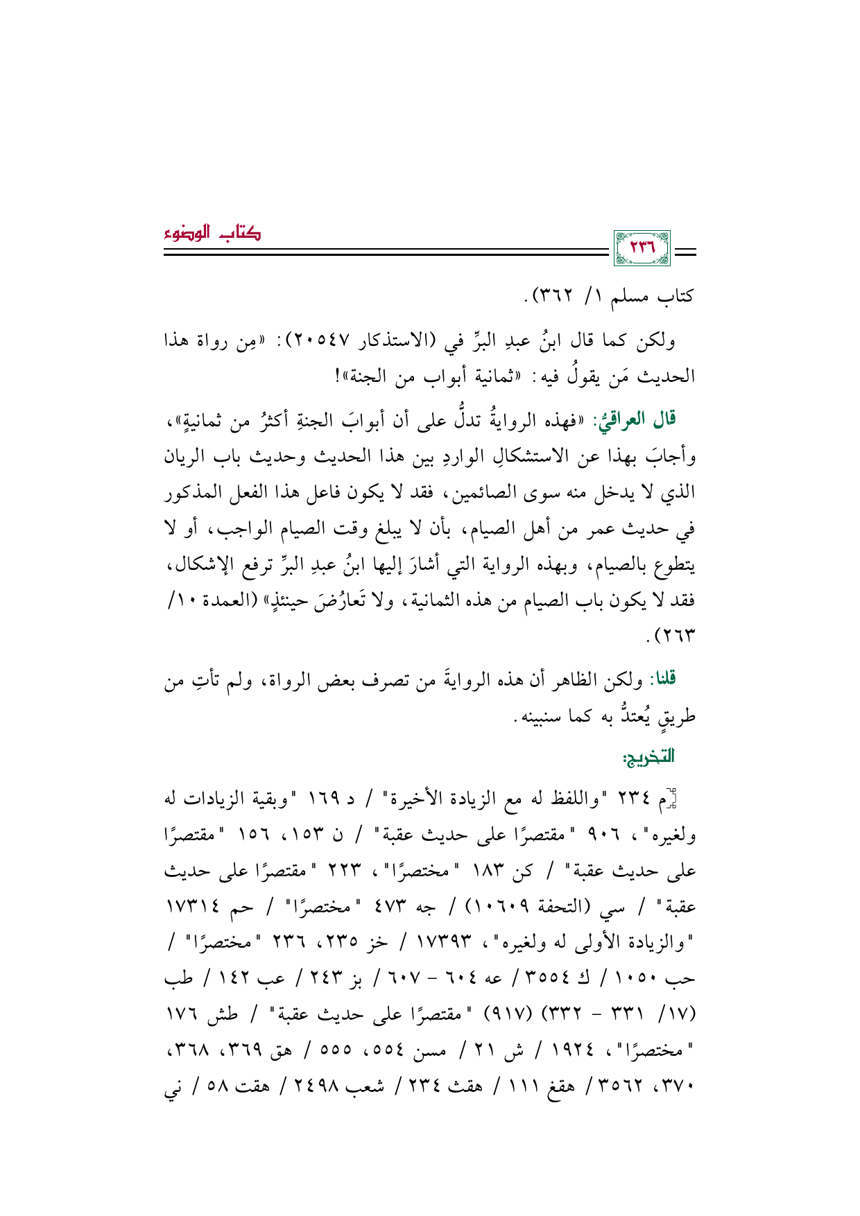 قال العراقيُّ: "فهذه الروايةُ تدلُّ على أن أبوابَ الجنةِ أكثرُ من ثمانيةٍ"، وأجابَ بهذا عن الاستشكالِ الواردِ بين هذا الحديث وحديث باب الريان الذي لا يدخل منه سوى الصائمين، فقد لا يكون فاعل هذا الفعل المذكور في حديث عمر من أهل الصيام، بأن لا يبلغ وقت الصيام الواجب، أو لا يتطوع بالصيام، وبهذه الرواية التي أشارَ إليها ابنُ عبدِ البرِّ ترفع الإشكال، فقد لا يكون باب الصيام من هذه الثمانية، ولا تَعارُضَ حينئذٍ" (العمدة ١٠/ ٢٦٣).