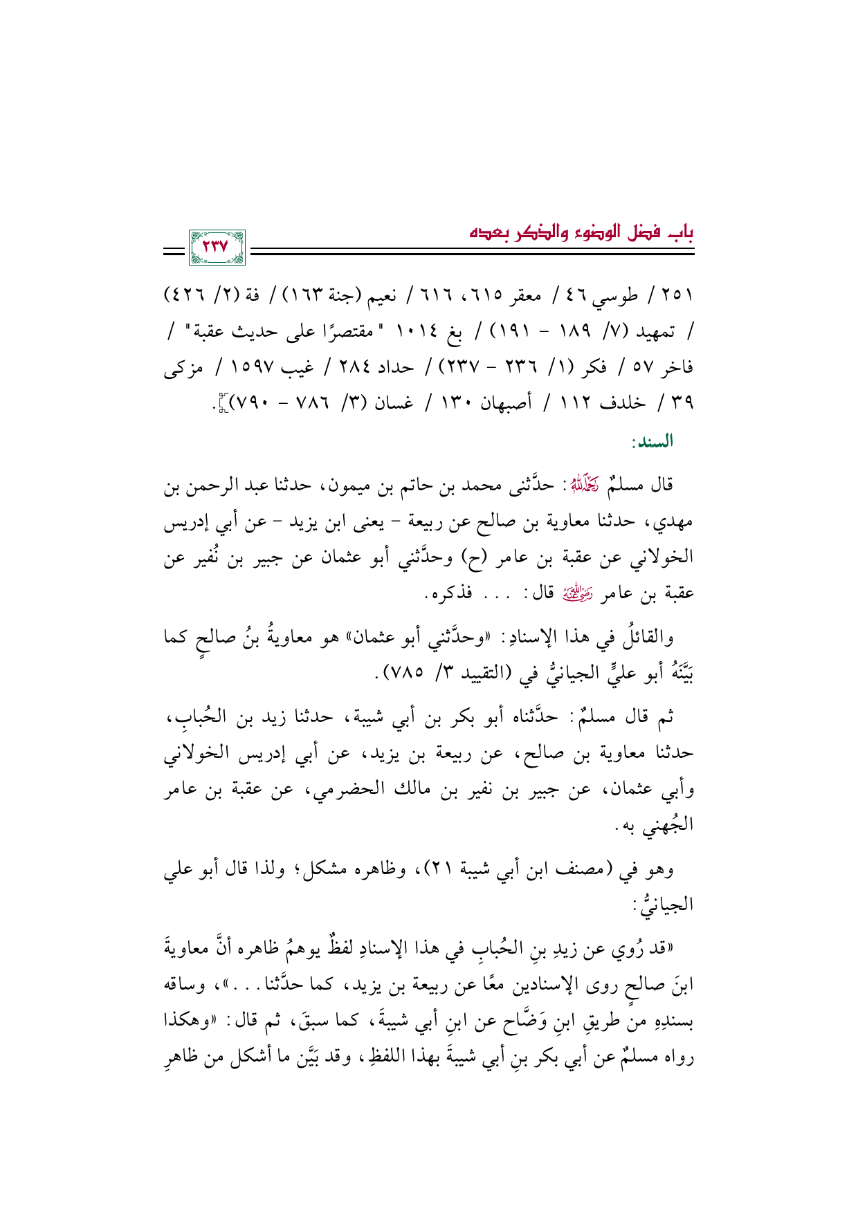ثم قال مسلمٌ: حدَّثناه أبو بكر بن أبي شيبة، حدثنا زيد بن الحُبابِ، حدثنا معاوية بن صالح، عن ربيعة بن يزيد، عن أبي إدريس الخولاني وأبي عثمان، عن جبير بن نفير بن مالك الحضرمي، عن عقبة بن عامر الجُهني به.
