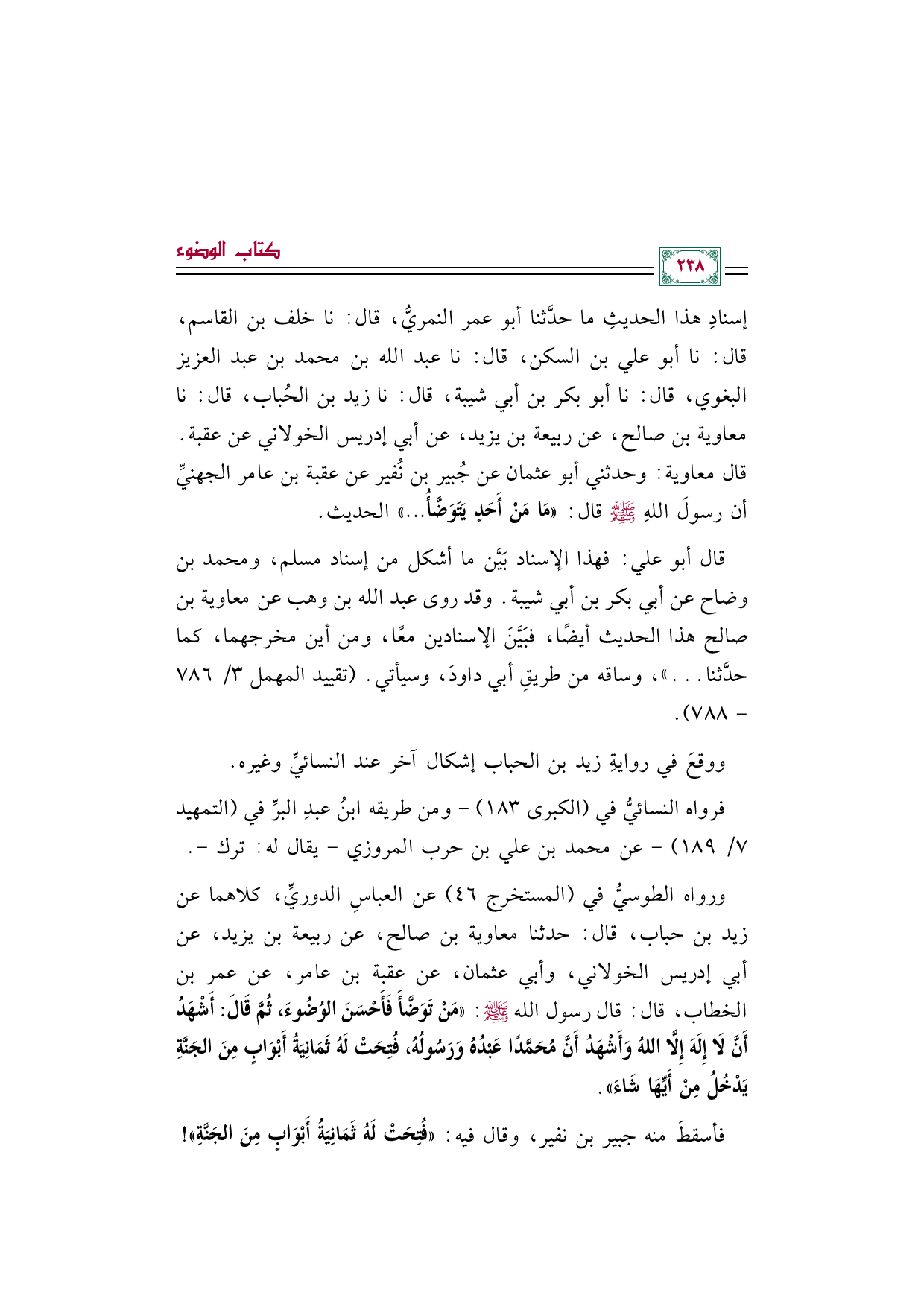 إسنادِ هذا الحديثِ ما حدَّثنا أبو عمر النمريُّ، قال: نا خلف بن القاسم، قال: نا أبو علي بن السكن، قال: نا عبد الله بن محمد بن عبد العزيز البغوي، قال: نا أبو بكر بن أبي شيبة، قال: نا زيد بن الحُباب، قال: نا معاوية بن صالح، عن ربيعة بن يزيد، عن أبي إدريس الخولاني عن عقبة. قال معاوية: وحدثني أبو عثمان عن جُبير بن نُفير عن عقبة بن عامر الجهنيِّ أن رسولَ اللهِ صلى الله عليه وسلم قال: «مَا مَنْ أَحَدٍ يَتَوَضَّأُ ... » الحديث.