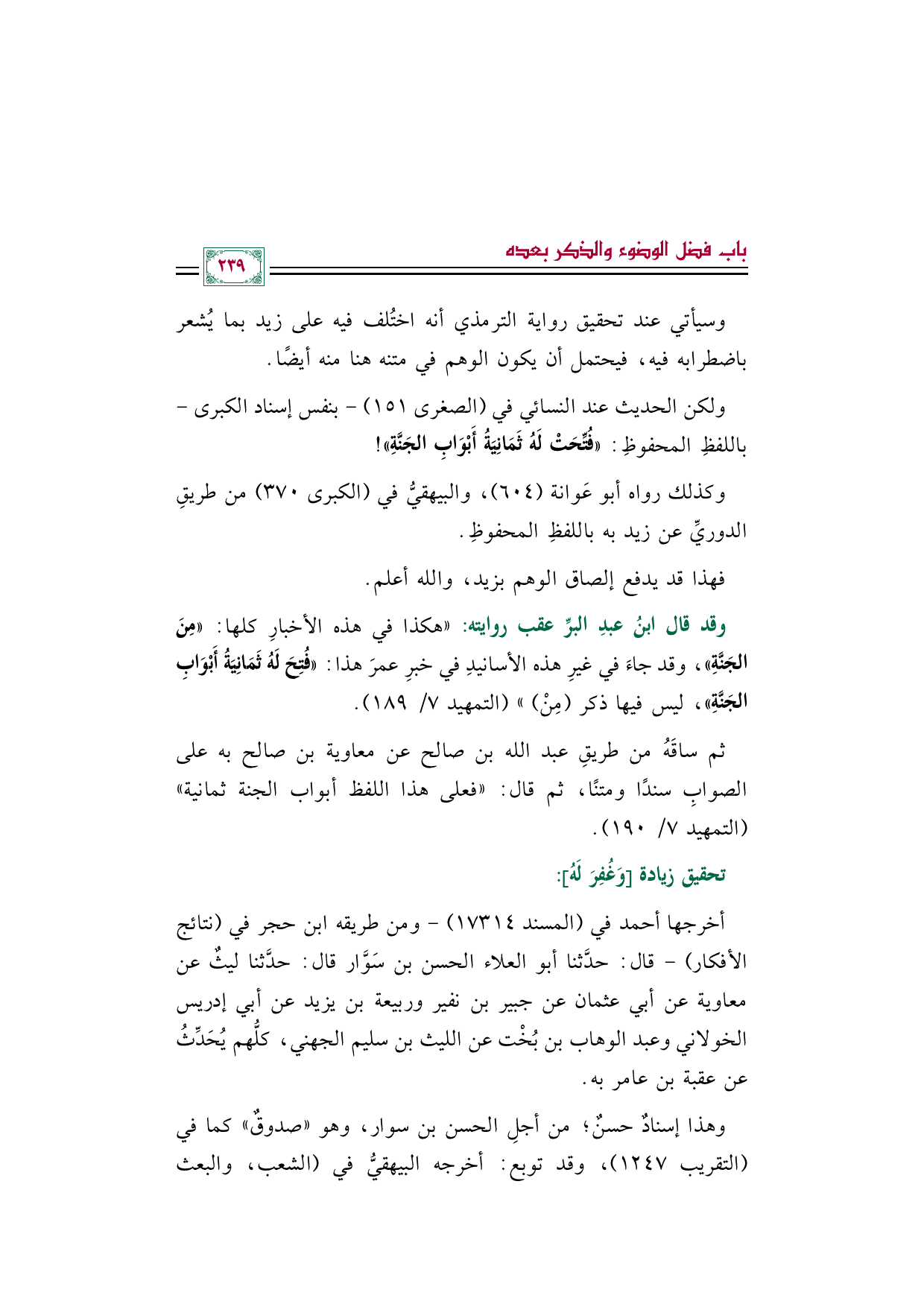 ثم ساقَهُ من طريقِ عبد الله بن صالح عن معاوية بن صالح به على الصوابِ سندًا ومتنًا، ثم قال: "فعلى هذا اللفظ أبواب الجنة ثمانية" (التمهيد ٧/ ١٩٠).