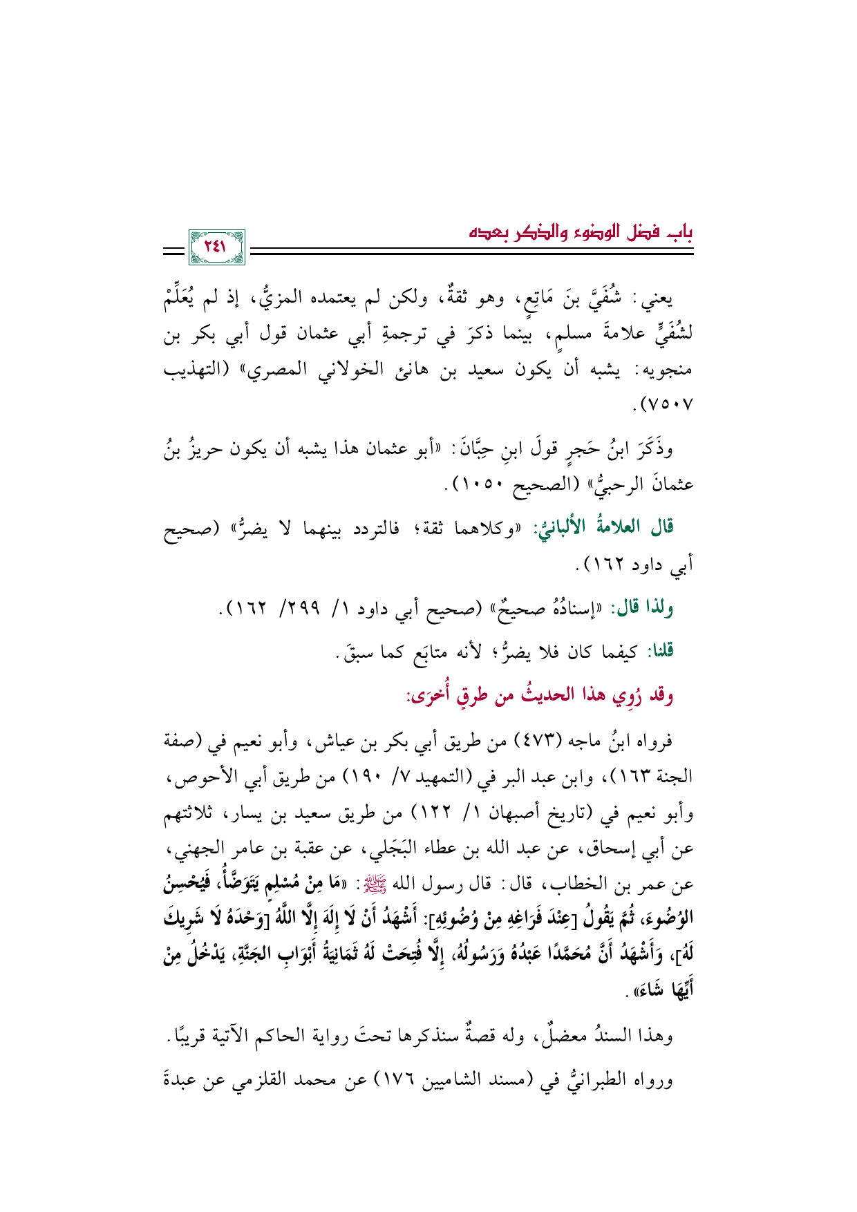 فرواه ابنُ ماجه (٤٧٣) من طريق أبي بكر بن عياش، وأبو نعيم في (صفة الجنة ١٦٣)، وابن عبد البر في (التمهيد ٧/ ١٩٠) من طريق أبي الأحوص، وأبو نعيم في (تاريخ أصبهان ١/ ١٢٢) من طريق سعيد بن يسار، ثلاثتهم عن أبي إسحاق، عن عبد الله بن عطاء البَجَلي، عن عقبة بن عامر الجهني، عن عمر بن الخطاب، قال: قال رسول الله صلى الله عليه وسلم: «مَا مِنْ مُسْلِمٍ يَتَوَضَّأُ، فَيُحْسِنُ الوُضُوءَ، ثُمَّ يَقُولُ [عِنْدَ فَرَاغِهِ مِنْ وُضُوئِهِ]: أَشْهَدُ أَنْ لَا إِلَهَ إِلَّا اللَّهُ [وَحْدَهُ لَا شَرِيكَ لَهُ]، وَأَشْهَدُ أَنَّ مُحَمَّدًا عَبْدُهُ وَرَسُولُهُ، إِلَّا فُتِحَتْ لَهُ ثَمَانِيَةُ أَبْوَابِ الجَنَّةِ، يَدْخُلُ مِنْ أَيِّهَا شَاءَ».