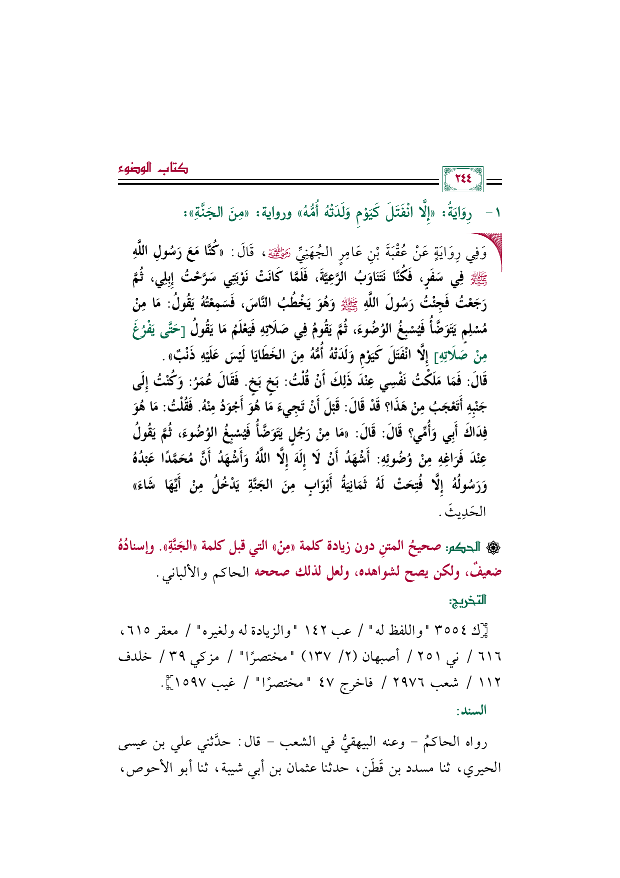 • وَفِي رِوَايَةٍ عَنْ عُقْبَةَ بْنِ عَامِرٍ الجُهَنِيِّ رضي الله عنه، قَالَ: «كُنَّا مَعَ رَسُولِ اللَّهِ صلى الله عليه وسلم فِي سَفَرٍ، فَكُنَّا نَتَنَاوَبُ الرَّعِيَّةَ، فَلَمَّا كَانَتْ نَوْبَتِي سَرَّحْتُ إِبِلِي، ثُمَّ رَجَعْتُ فَجِئْتُ رَسُولَ اللَّهِ صلى الله عليه وسلم وَهُوَ يَخْطُبُ النَّاسَ، فَسَمِعْتُهُ يَقُولُ: «مَا مِنْ مُسْلِمٍ يَتَوَضَّأُ فَيُسْبِغُ الوُضُوءَ، ثُمَّ يَقُومُ فِي صَلَاتِهِ فَيَعْلَمُ مَا يَقُولُ [حَتَّى يَفْرُغَ مِنْ صَلَاتِهِ] إِلَّا انْفَتَلَ كَيَوْمِ وَلَدَتْهُ أُمُّهُ مِنَ الخَطَايَا لَيْسَ عَلَيْهِ ذَنْبٌ».