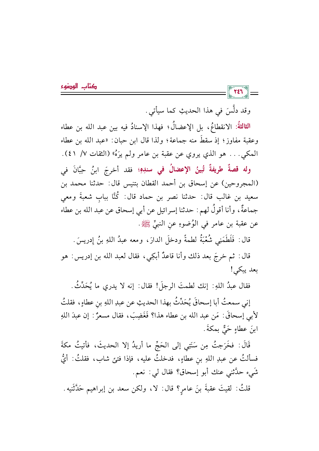 الثالثةُ: الانقطاعُ، بل الإعضالُ؛ فهذا الإسنادُ فيه بين عبد الله بن عطاء وعقبة مفاوز؛ إذ سقطَ منه جماعة؛ ولذا قال ابن حبان: "عبد الله بن عطاء المكي ... هو الذي يروي عن عقبة بن عامر ولم يرَهُ" (الثقات ٧/ ٤١).