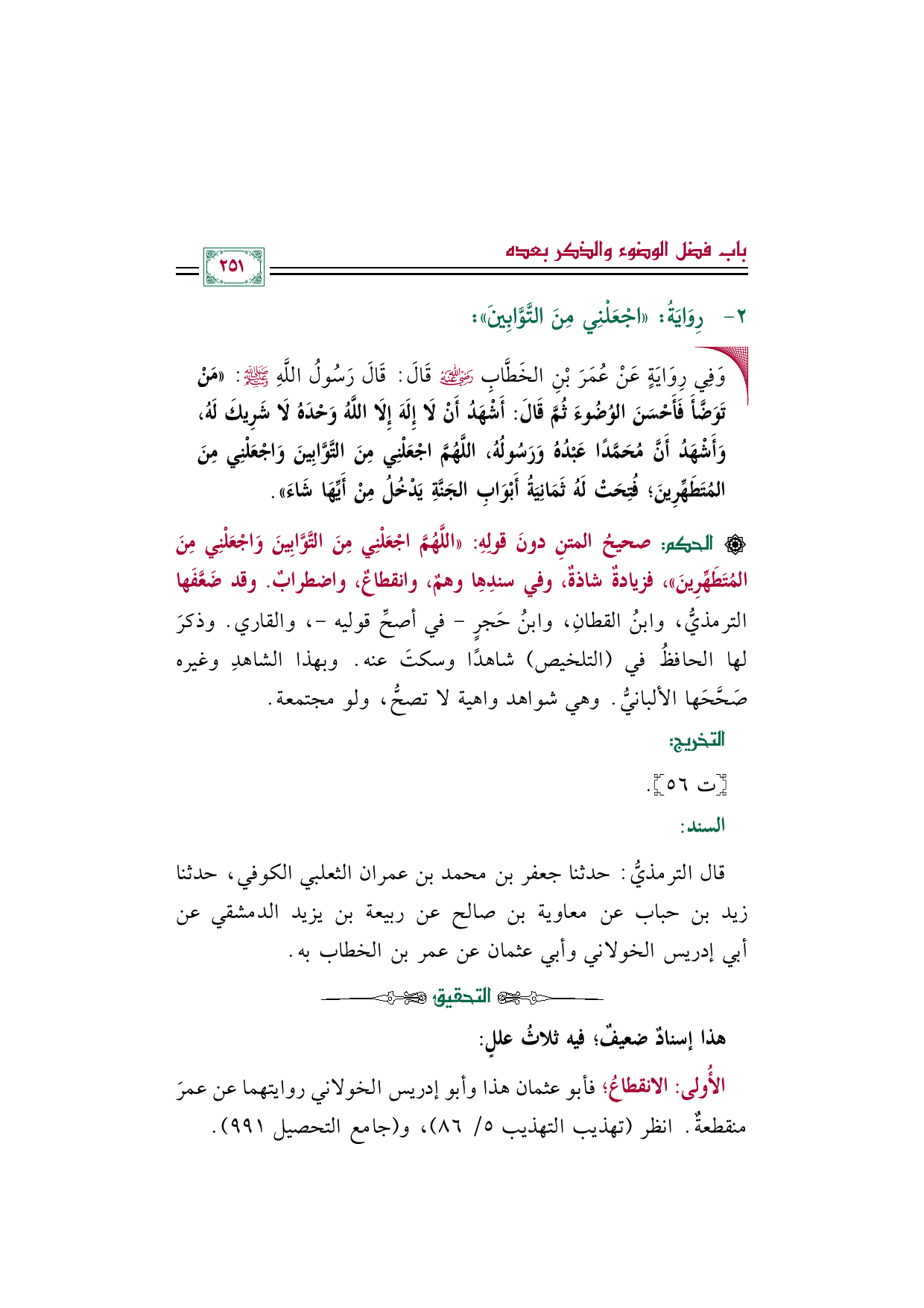 قال الترمذيُّ: حدثنا جعفر بن محمد بن عمران الثعلبي الكوفي، حدثنا زيد بن حباب عن معاوية بن صالح عن ربيعة بن يزيد الدمشقي عن أبي إدريس الخولاني وأبي عثمان عن عمر بن الخطاب به.
