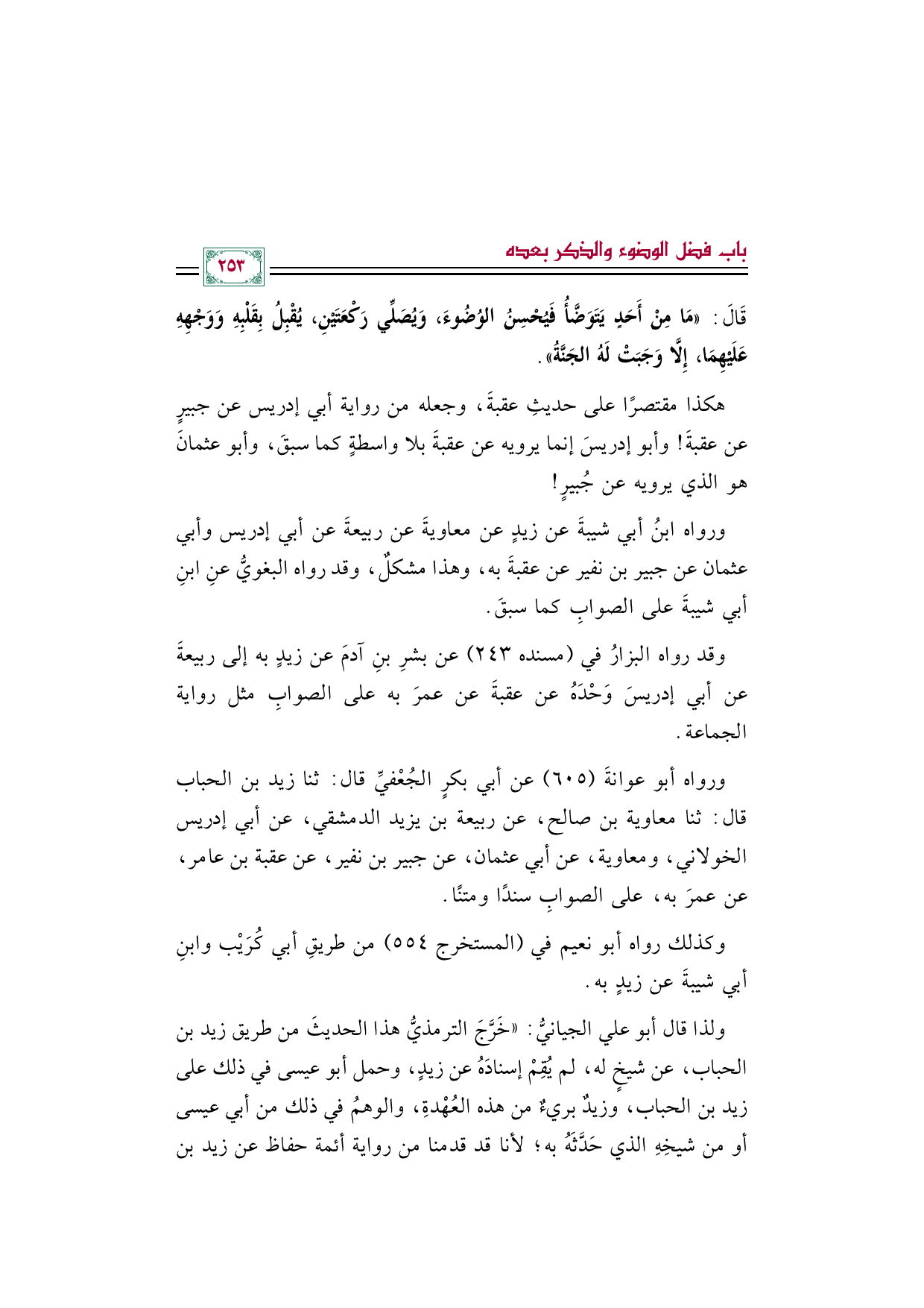 ورواه ابنُ أبي شيبةَ عن زيدٍ عن معاويةَ عن ربيعةَ عن أبي إدريس وأبي عثمان عن جبير بن نفير عن عقبةَ به، وهذا مشكلٌ، وقد رواه البغويُّ عنِ ابنِ أبي شيبةَ على الصوابِ كما سبقَ.