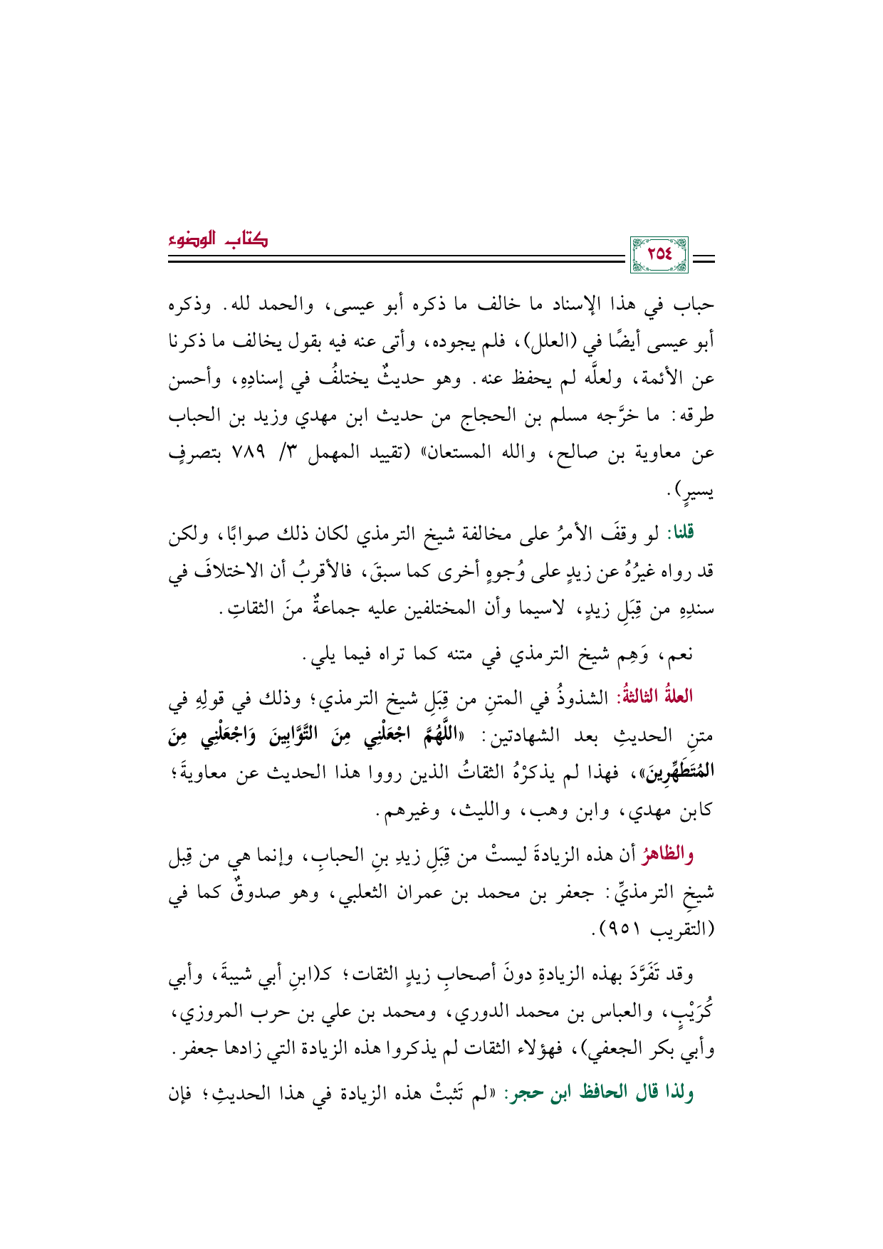 العلةُ الثالثةُ: الشذوذُ في المتنِ من قِبَلِ شيخ الترمذي؛ وذلك في قولِهِ في متنِ الحديثِ بعد الشهادتين: «اللَّهُمَّ اجْعَلْنِي مِنَ التَّوَّابِينَ وَاجْعَلْنِي مِنَ المُتَطَهِّرِينَ»، فهذا لم يذكرْهُ الثقاتُ الذين رووا هذا الحديث عن معاويةَ؛ كابن مهدي، وابن وهب، والليث، وغيرهم.