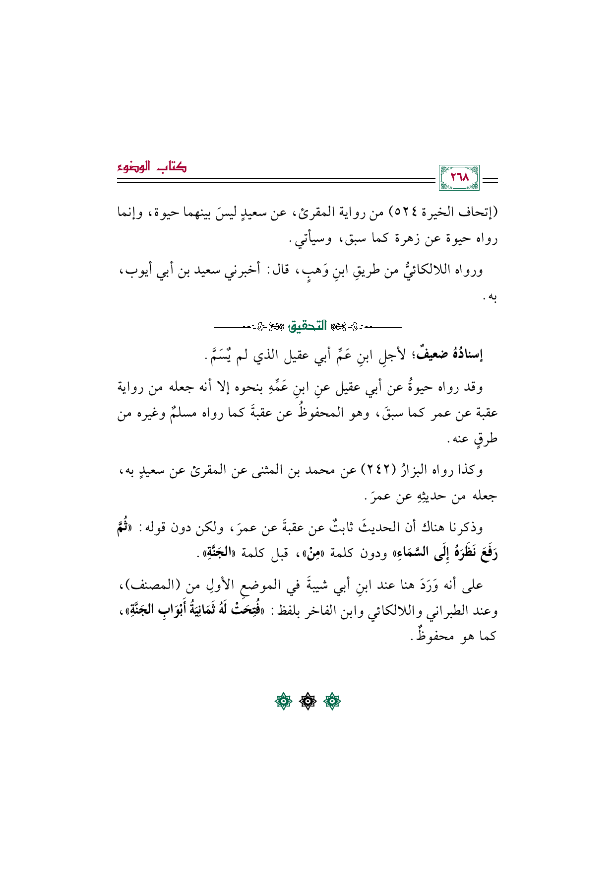 وذكرنا هناك أن الحديثَ ثابتٌ عن عقبةَ عن عمرَ، ولكن دون قوله: «ثُمَّ رَفَعَ نَظَرَهُ إِلَى السَّمَاءِ» ودون كلمة «مِنْ»، قبل كلمة «الجَنَّةِ».