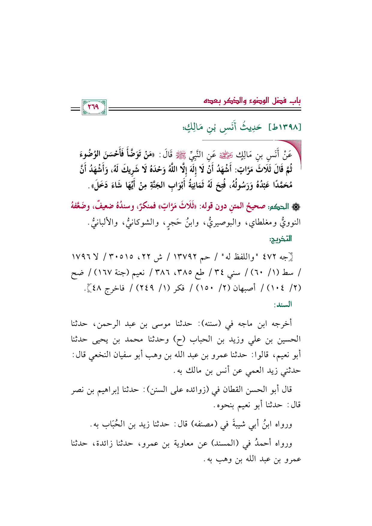 أخرجه ابن ماجه في (سننه): حدثنا موسى بن عبد الرحمن، حدثنا الحسين بن علي وزيد بن الحباب (ح) وحدثنا محمد بن يحيى حدثنا أبو نعيم، قالوا: حدثنا عمرو بن عبد الله بن وهب أبو سفيان النخعي قال: حدثني زيد العمي عن أنس بن مالك به.