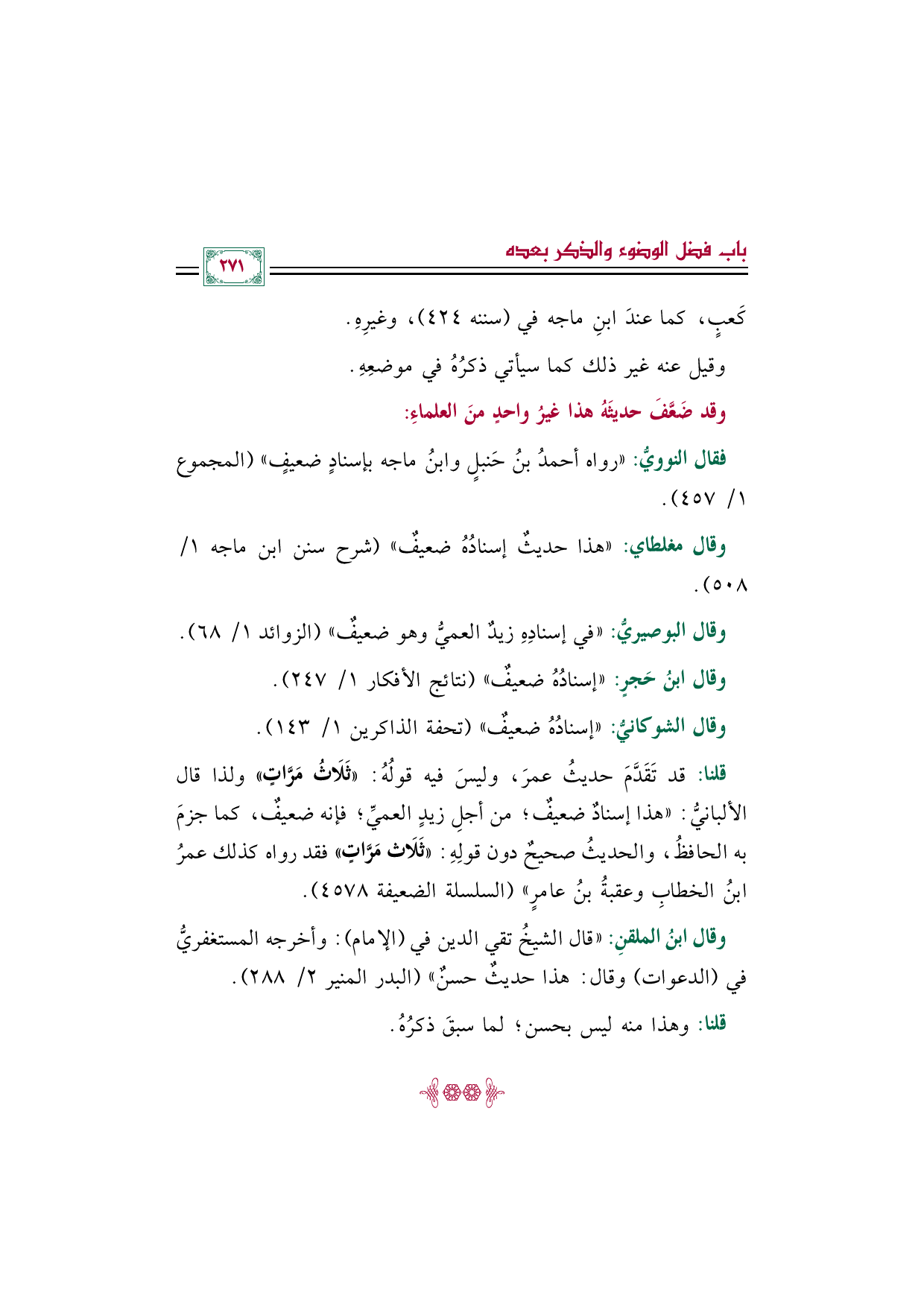 قلنا: قد تَقَدَّمَ حديثُ عمرَ، وليسَ فيه قولُهُ: «ثَلَاثُ مَرَّاتٍ» ولذا قال الألبانيُّ: ((هذا إسنادٌ ضعيفٌ؛ من أجلِ زيدٍ العميِّ؛ فإنه ضعيفٌ، كما جزمَ به الحافظُ، والحديثُ صحيحٌ دون قولِهِ: «ثَلَاث مَرَّاتٍ» فقد رواه كذلك عمرُ بنُ الخطابِ وعقبةُ بنُ عامرٍ)) (السلسلة الضعيفة ٤٥٧٨).