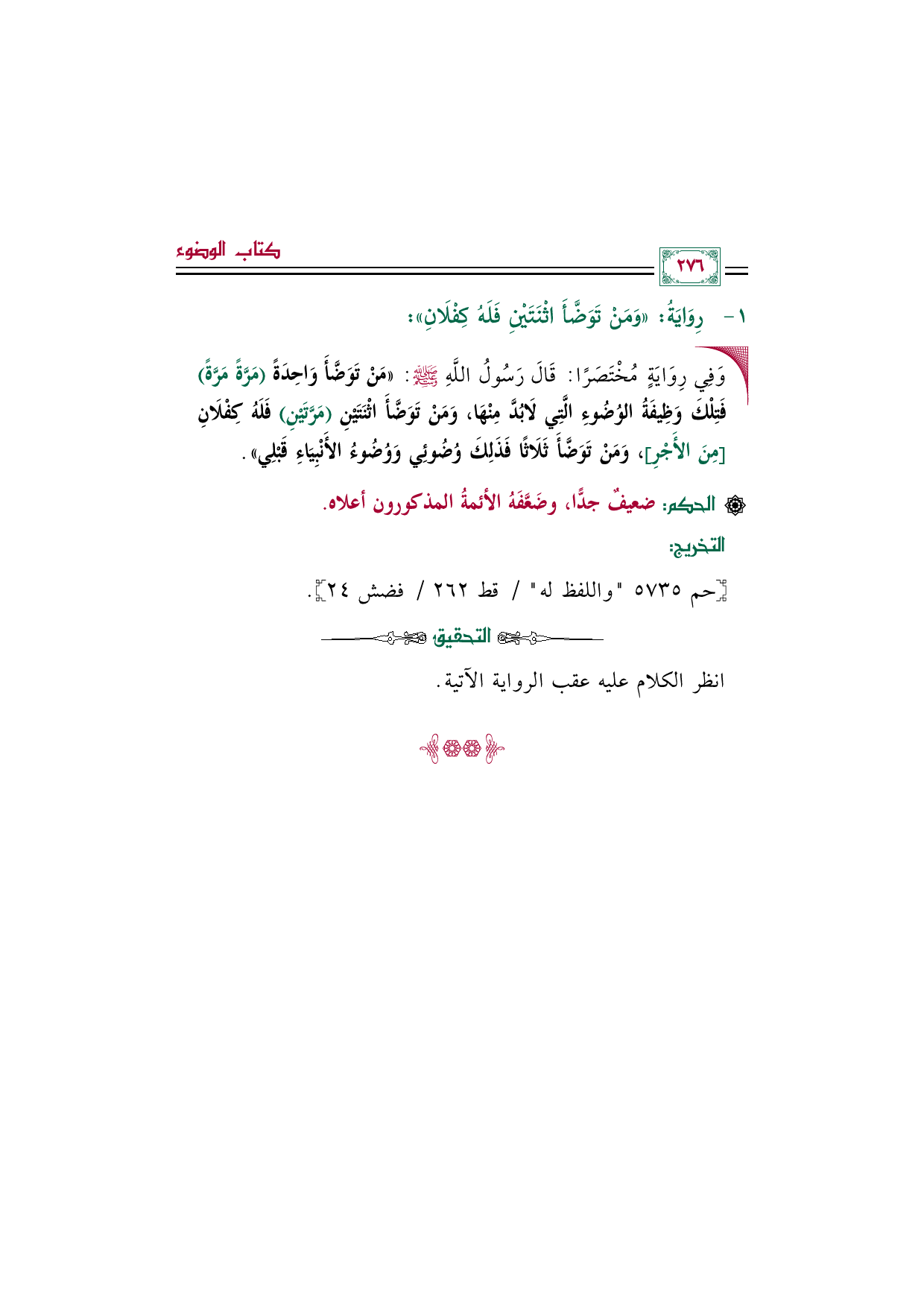 رِوَايَةُ: وَمَنْ تَوَضَّأَ اثْنَتَيْنِ فَلَهُ كِفْلَانِ