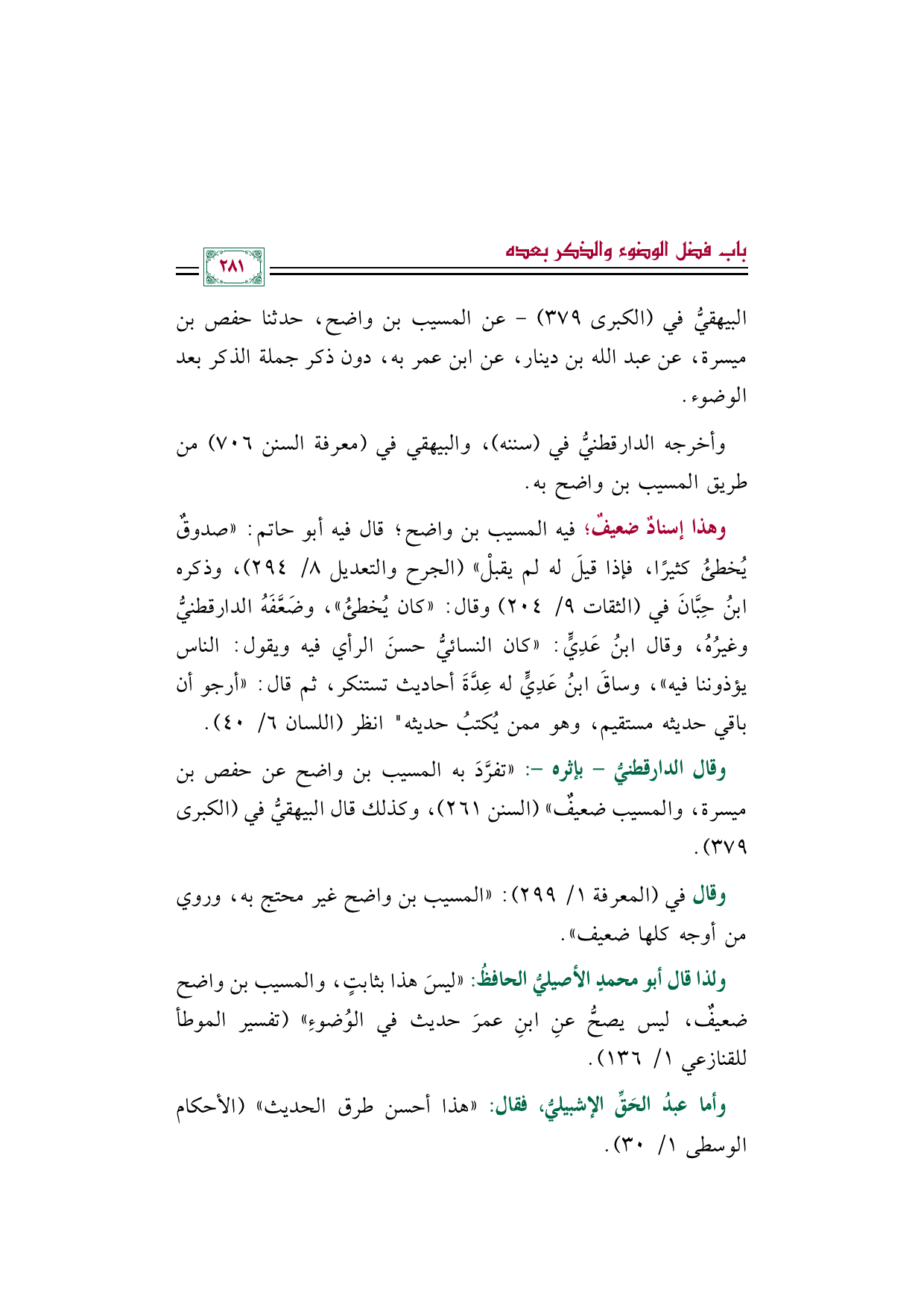 ولذا قال أبو محمدٍ الأصيليُّ الحافظُ: "ليسَ هذا بثابتٍ، والمسيب بن واضح ضعيفٌ، ليس يصحُّ عنِ ابنِ عمرَ حديث في الوُضوءِ" (تفسير الموطأ للقنازعي ١/ ١٣٦).