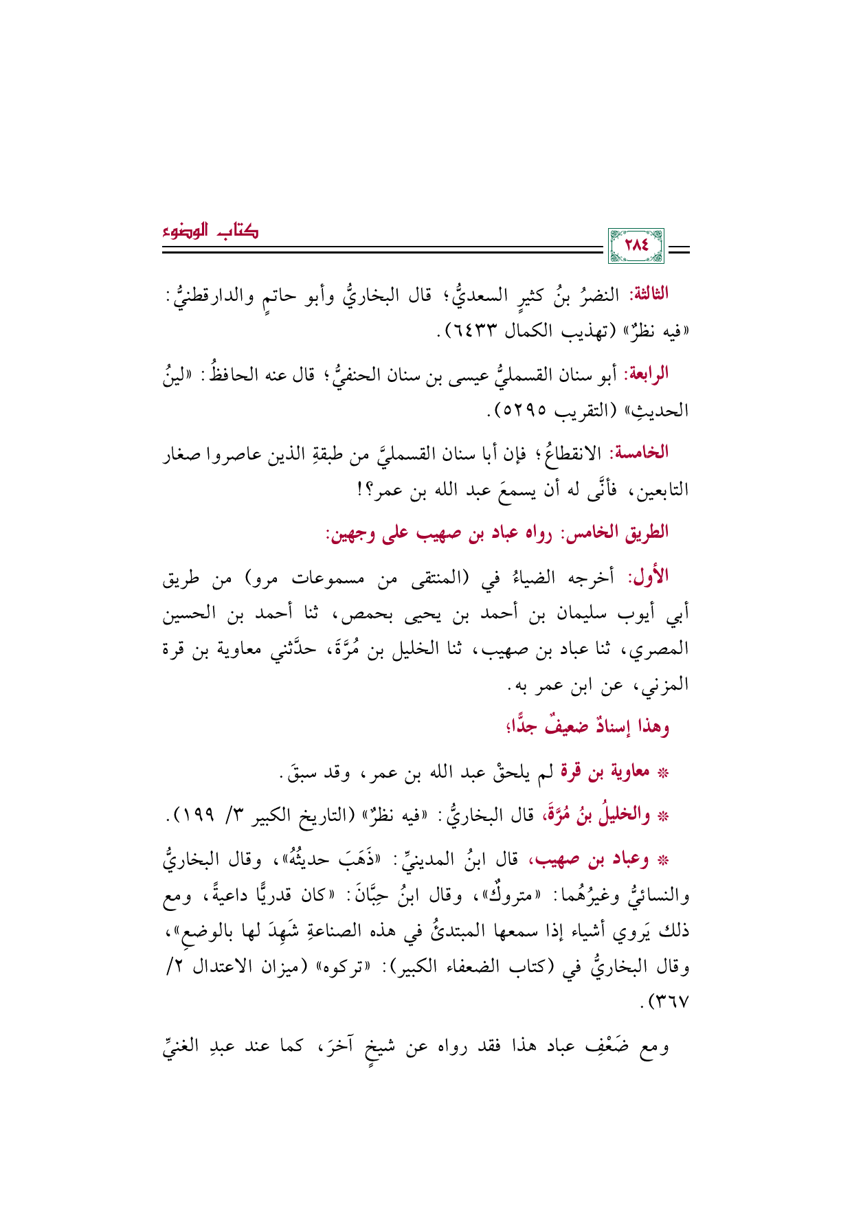 الخامسة: الانقطاعُ؛ فإن أبا سنان القسمليَّ من طبقةِ الذين عاصروا صغار التابعين، فأنَّى له أن يسمعَ عبد الله بن عمر؟ !