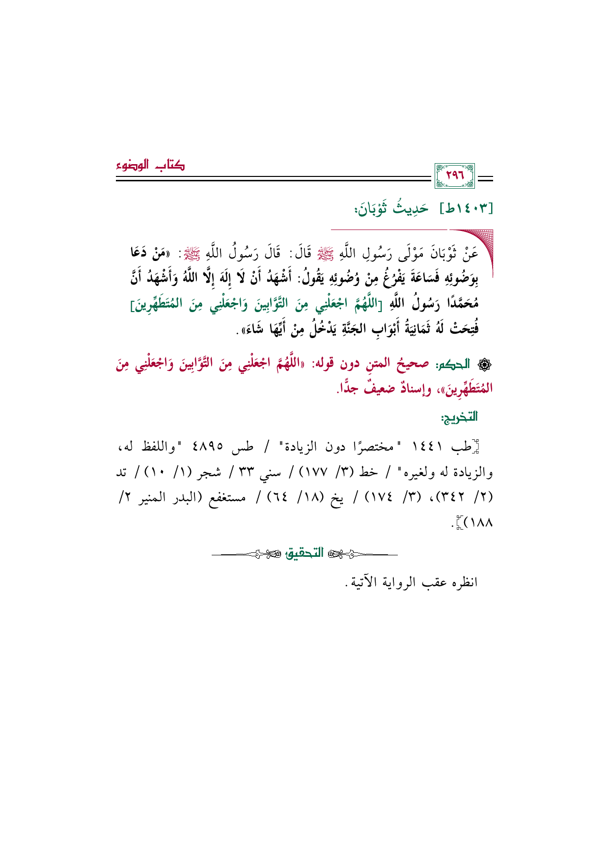 ◼ عَنْ ثَوْبَانَ مَوْلَى رَسُولِ اللَّهِ صلى الله عليه وسلم قَالَ: قَالَ رَسُولُ اللَّهِ صلى الله عليه وسلم: «مَنْ دَعَا بِوَضُوئِهِ فَسَاعَةَ يَفْرُغُ مِنْ وُضُوئِهِ يَقُولُ: أَشْهَدُ أَنْ لَا إِلَهَ إِلَّا اللَّهُ وَأَشْهَدُ أَنَّ مُحَمَّدًا رَسُولُ اللَّهِ [اللَّهُمَّ اجْعَلْنِي مِنَ التَّوَّابِينَ وَاجْعَلْنِي مِنَ المُتَطَهِّرِينَ] فُتِحَتْ لَهُ ثَمَانِيَةُ أَبْوَابِ الجَنَّةِ يَدْخُلُ مِنْ أَيِّهَا شَاءَ».