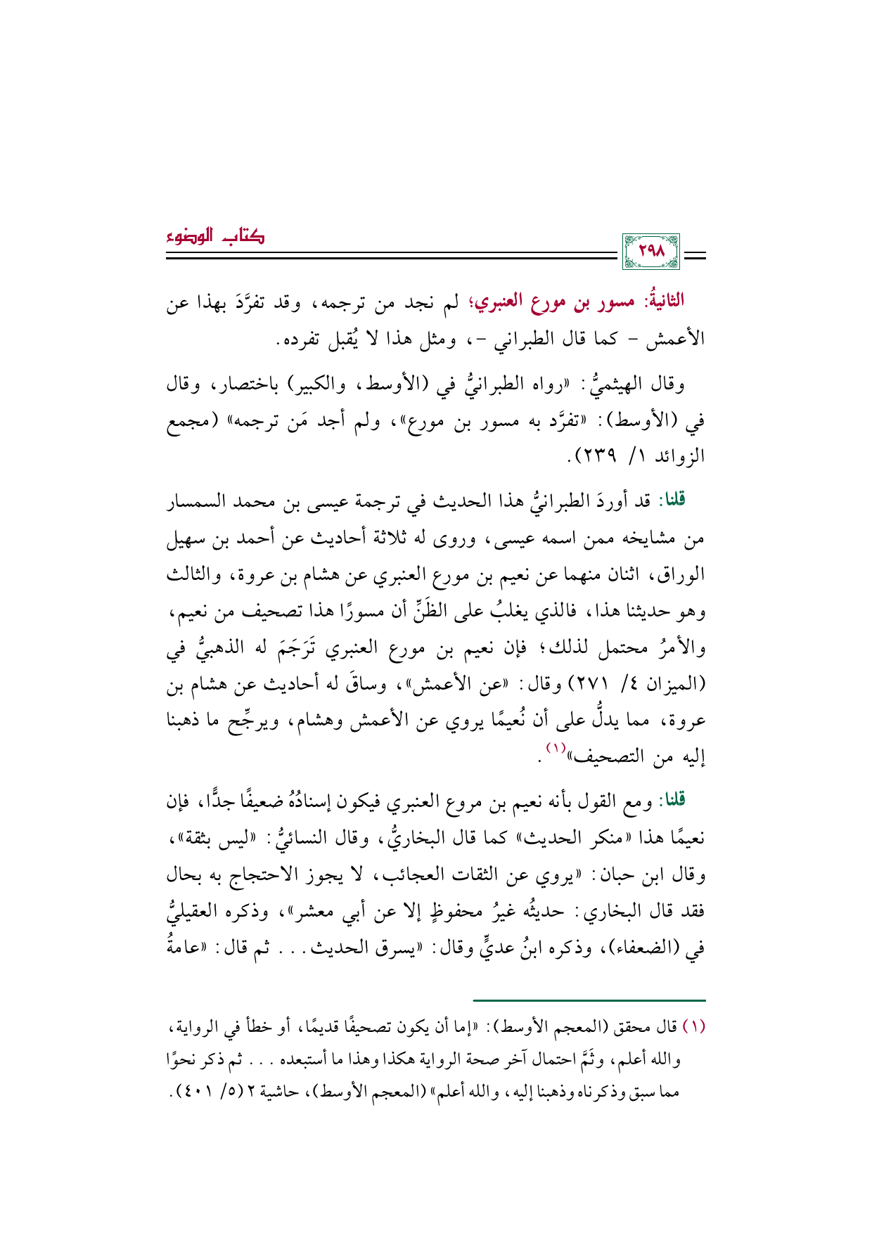 قلنا: قد أوردَ الطبرانيُّ هذا الحديث في ترجمة عيسى بن محمد السمسار من مشايخه ممن اسمه عيسى، وروى له ثلاثة أحاديث عن أحمد بن سهيل الوراق، اثنان منهما عن نعيم بن مورع العنبري عن هشام بن عروة، والثالث وهو حديثنا هذا، فالذي يغلبُ على الظَنِّ أن مسورًا هذا تصحيف من نعيم، والأمرُ محتمل لذلك؛ فإن نعيم بن مورع العنبري تَرَجَمَ له الذهبيُّ في (الميزان ٤/ ٢٧١) وقال: "عن الأعمش"، وساقَ له أحاديث عن هشام بن عروة، مما يدلُّ على أن نُعيمًا يروي عن الأعمش وهشام، ويرجِّح ما ذهبنا إليه من التصحيف" (¬١).