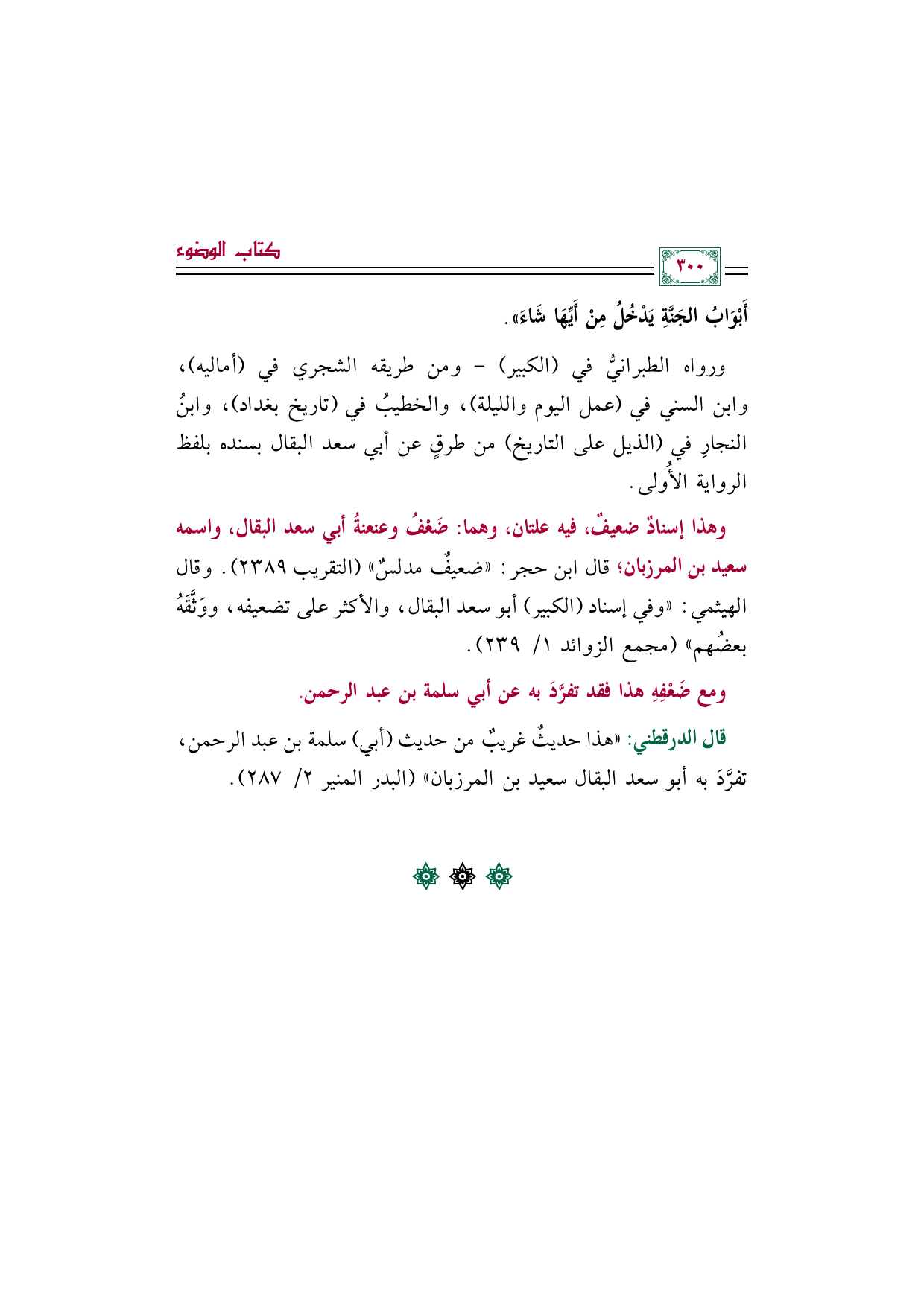 قال الدرقطني: "هذا حديثٌ غريبٌ من حديث (أبي) سلمة بن عبد الرحمن، تفرَّدَ به أبو سعد البقال سعيد بن المرزبان" (البدر المنير ٢/ ٢٨٧).