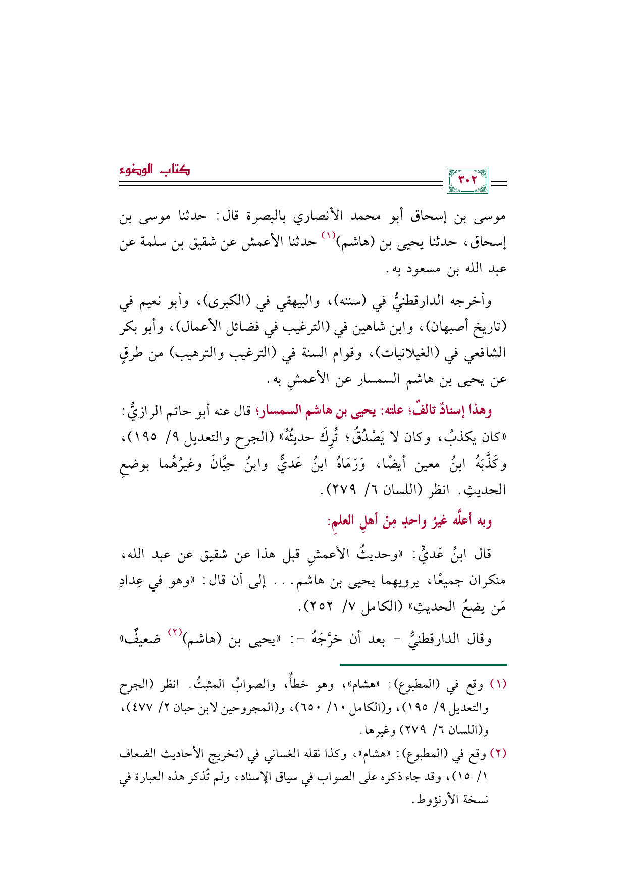موسى بن إسحاق أبو محمد الأنصاري بالبصرة قال: حدثنا موسى بن إسحاق، حدثنا يحيى بن (هاشم) (¬١) حدثنا الأعمش عن شقيق بن سلمة عن عبد الله بن مسعود به.