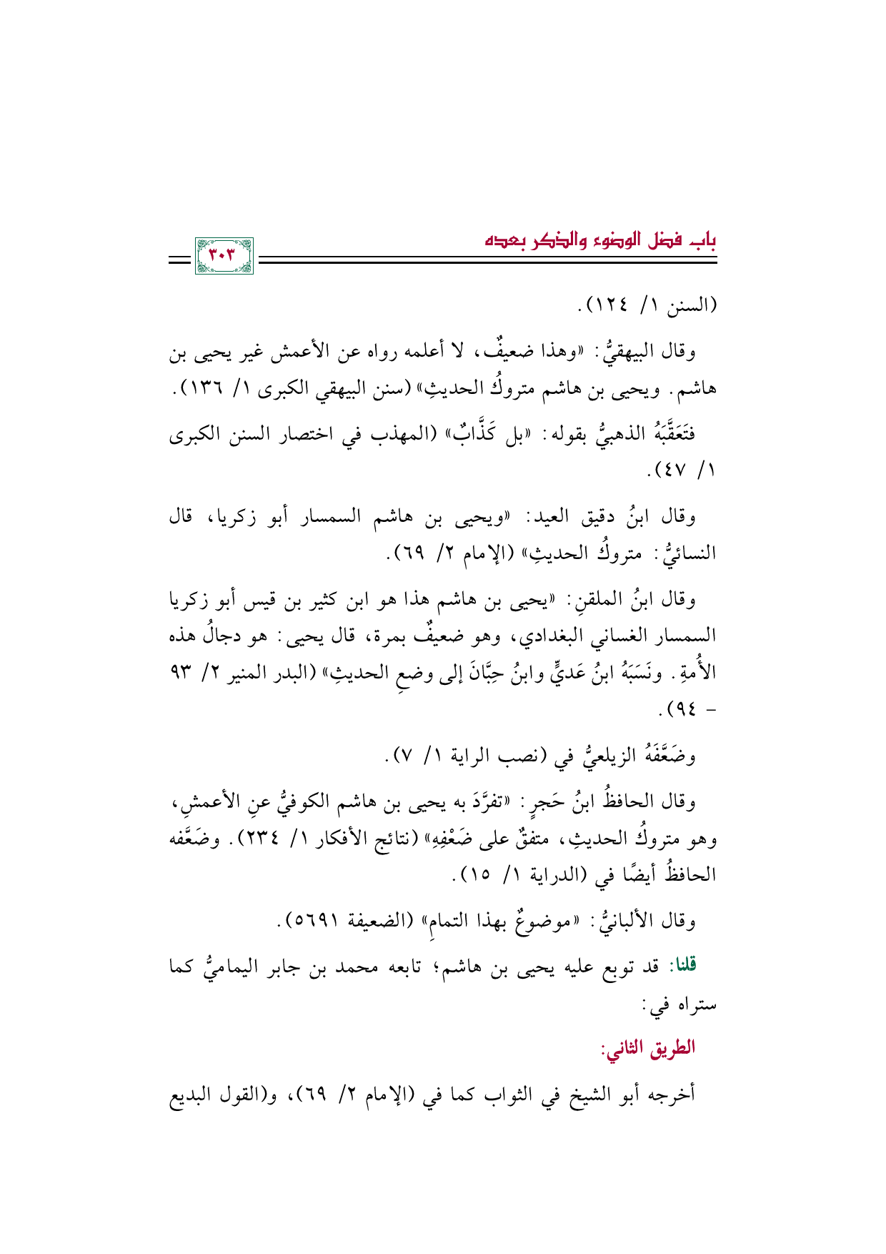 وقال البيهقيُّ: "وهذا ضعيفٌ، لا أعلمه رواه عن الأعمش غير يحيى بن هاشم. ويحيى بن هاشم متروكُ الحديثِ" (سنن البيهقي الكبرى ١/ ١٣٦).