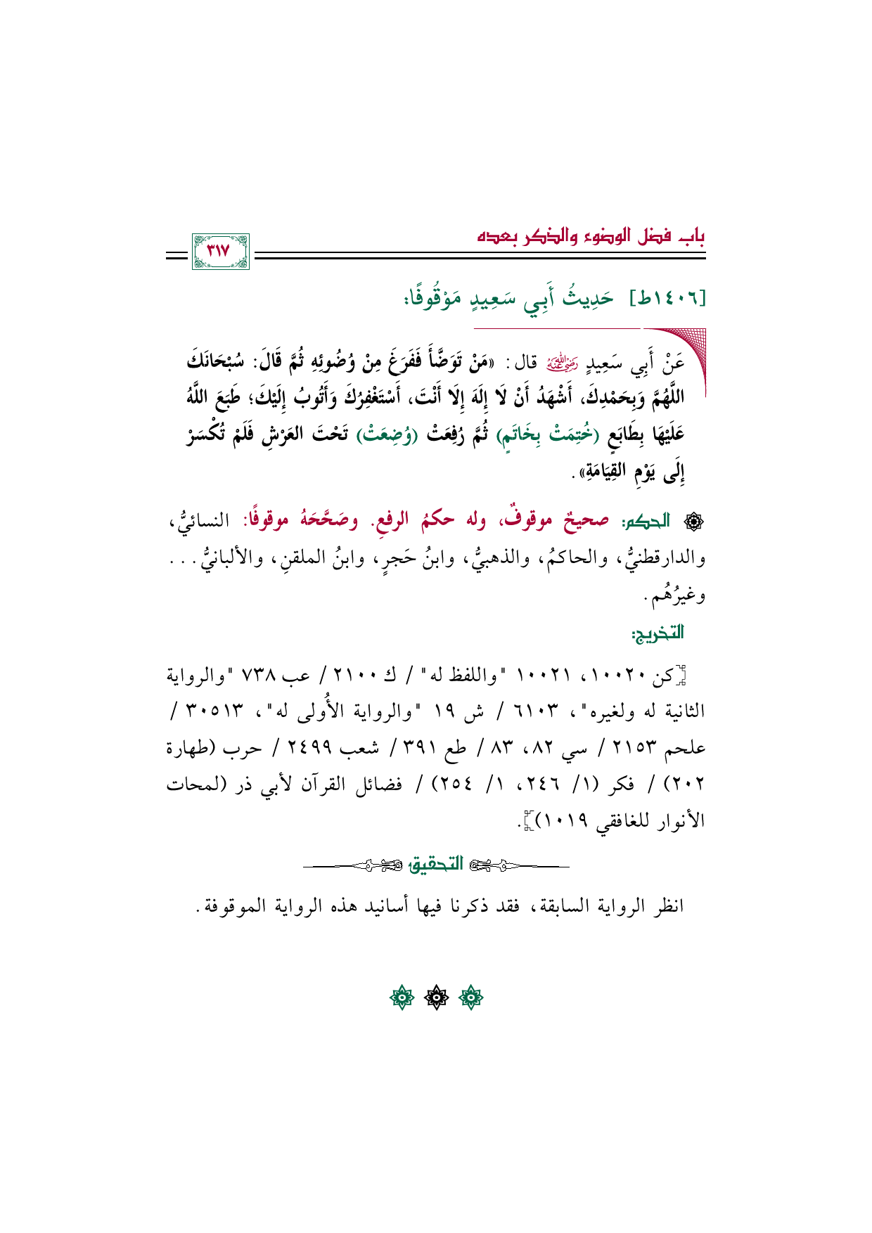 ◼ عَنْ أَبِي سَعِيدٍ رضي الله عنه قال: «مَنْ تَوَضَّأَ فَفَرَغَ مِنْ وُضُوئِهِ ثُمَّ قَالَ: سُبْحَانَكَ اللَّهُمَّ وَبِحَمْدِكَ، أَشْهَدُ أَنْ لَا إِلَهَ إِلَا أَنْتَ، أَسْتَغْفِرُكَ وَأَتُوبُ إِلَيْكَ؛ طَبَعَ اللَّهُ عَلَيْهَا بِطَابَعٍ (خُتِمَتْ بِخَاتَمٍ) ثُمَّ رُفِعَتْ (وُضِعَتْ) تَحْتَ العَرْشِ فَلَمْ تُكْسَرْ إِلَى يَوْمِ القِيَامَةِ».