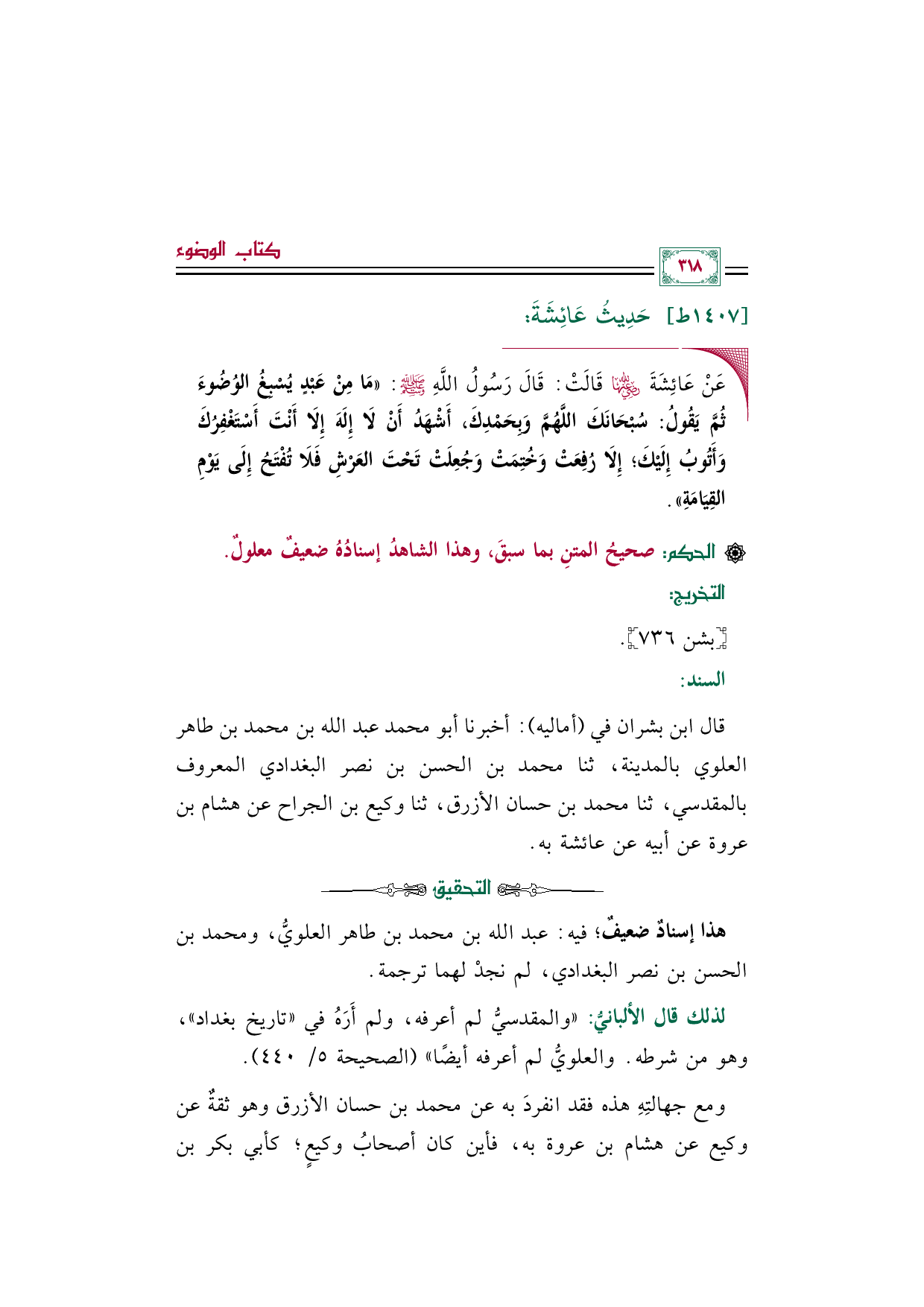 ◼عَنْ عَائِشَةَ رضي الله عنها قَالَتْ: قَالَ رَسُولُ اللَّهِ صلى الله عليه وسلم: «مَا مِنْ عَبْدٍ يُسْبِغُ الوُضُوءَ ثُمَّ يَقُولُ: سُبْحَانَكَ اللَّهُمَّ وَبِحَمْدِكَ، أَشْهَدُ أَنْ لَا إِلَهَ إِلَا أَنْتَ أَسْتَغْفِرُكَ وَأَتُوبُ إِلَيْكَ؛ إِلَا رُفِعَتْ وَخُتِمَتْ وَجُعِلَتْ تَحْتَ العَرْشِ فَلَا تُفْتَحُ إِلَى يَوْمِ القِيَامَةِ».