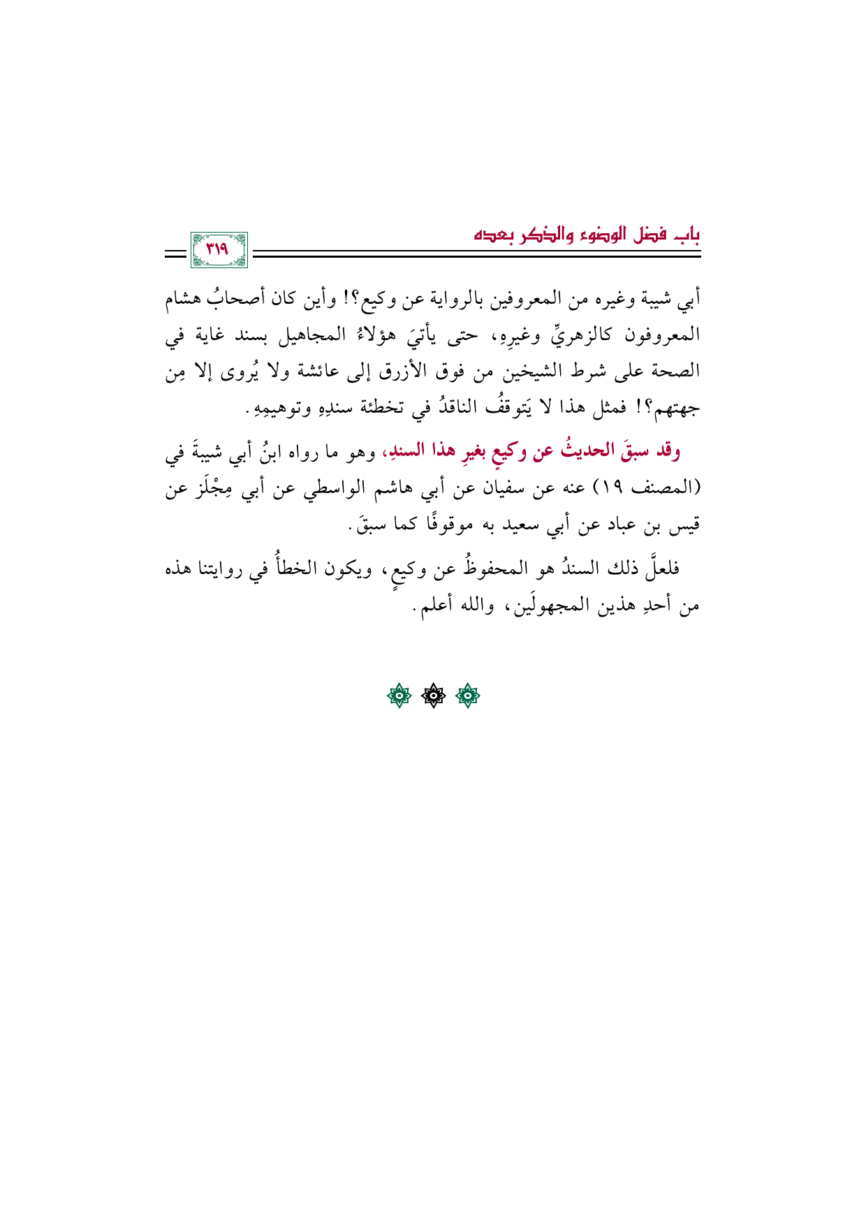 وقد سبقَ الحديثُ عن وكيعٍ بغيرِ هذا السندِ، وهو ما رواه ابنُ أبي شيبةَ في (المصنف ١٩) عنه عن سفيان عن أبي هاشم الواسطي عن أبي مِجْلَز عن قيس بن عباد عن أبي سعيد به موقوفًا كما سبقَ.