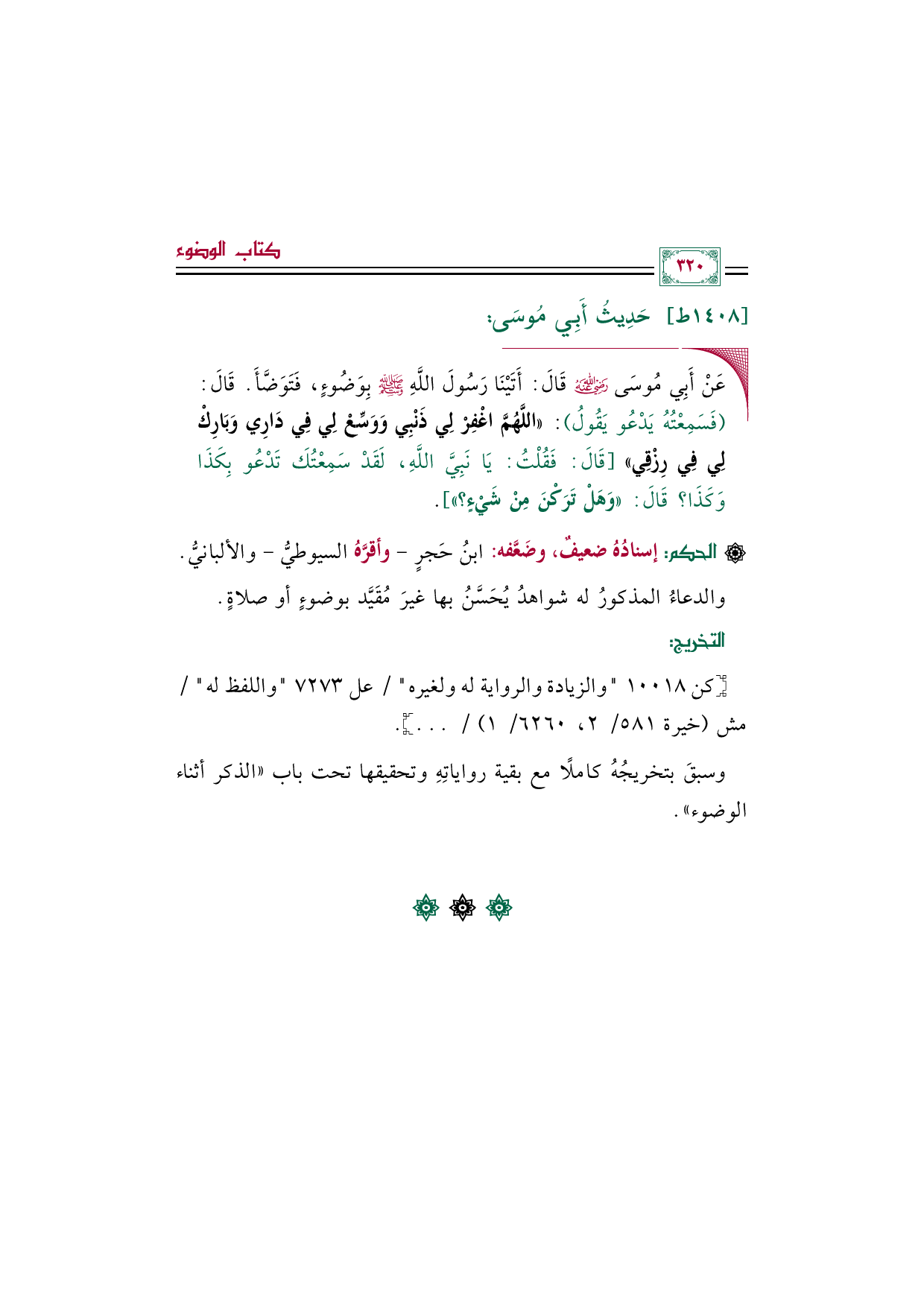 ◼ عَنْ أَبِي مُوسَى رضي الله عنه قَالَ: أَتَيْنَا رَسُولَ اللَّهِ صلى الله عليه وسلم بِوَضُوءٍ، فَتَوَضَّأَ. قَالَ: (فَسَمِعْتُهُ يَدْعُو يَقُولُ): «اللَّهُمَّ اغْفِرْ لِي ذَنْبِي وَوَسِّعْ لِي فِي دَارِي وَبَارِكْ لِي فِي رِزْقِي» [قَالَ: فَقُلْتُ: يَا نَبِيَّ اللَّهِ، لَقَدْ سَمِعْتُكَ تَدْعُو بِكَذَا وَكَذَا؟ قَالَ: «وَهَلْ تَرَكْنَ مِنْ شَيْءٍ؟ »].