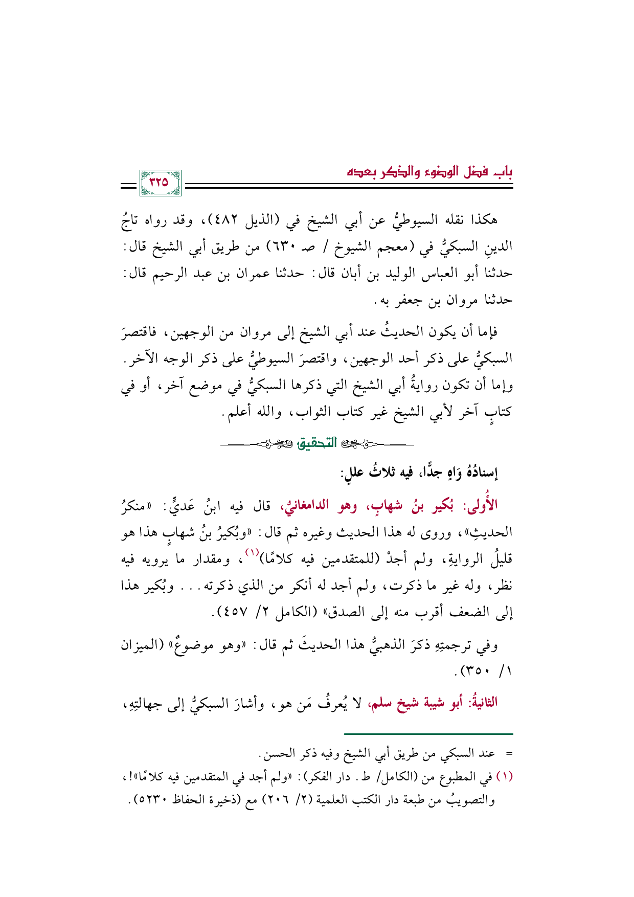فإما أن يكون الحديثُ عند أبي الشيخ إلى مروان من الوجهين، فاقتصرَ السبكيُّ على ذكر أحد الوجهين، واقتصرَ السيوطيُّ على ذكر الوجه الآخر. وإما أن تكون روايةُ أبي الشيخ التي ذكرها السبكيُّ في موضع آخر، أو في كتابٍ آخر لأبي الشيخ غير كتاب الثواب، والله أعلم.