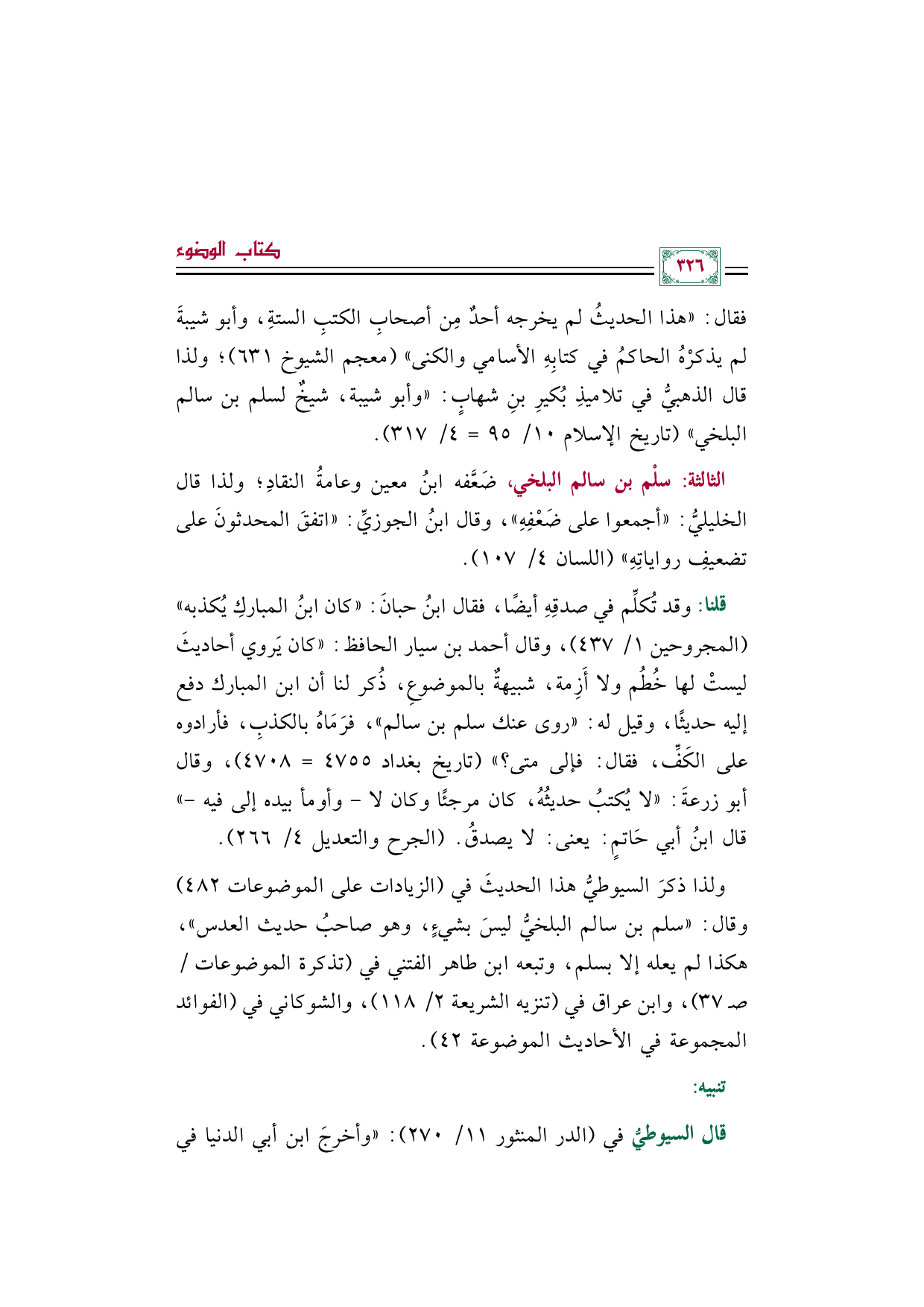ولذا ذكرَ السيوطيُّ هذا الحديثَ في (الزيادات على الموضوعات ٤٨٢) وقال: "سلم بن سالم البلخيُّ ليسَ بشيءٍ، وهو صاحبُ حديث العدس"، هكذا لم يعله إلا بسلم، وتبعه ابن طاهر الفتني في (تذكرة الموضوعات/ صـ ٣٧)، وابن عراق في (تنزيه الشريعة ٢/ ١١٨)، والشوكاني في (الفوائد المجموعة في الأحاديث الموضوعة ٤٢).