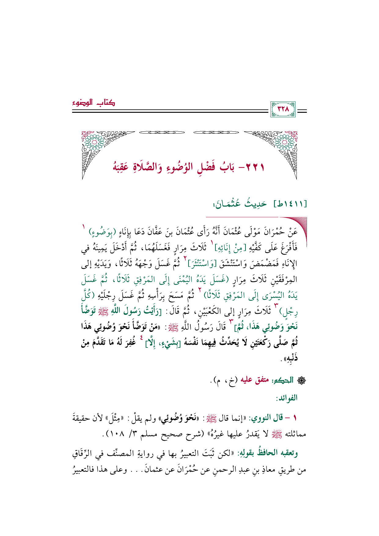 ١ - قال النووي: ((إنما قال صلى الله عليه وسلم: «نَحْوَ وُضُوئِي» ولم يقلْ: "مِثْلَ" لأن حقيقةَ مماثلته صلى الله عليه وسلم لا يَقدرُ عليها غيرُهُ)) (شرح صحيح مسلم ٣/ ١٠٨).