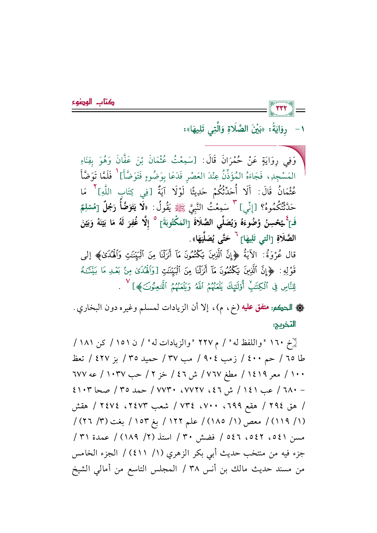 ◼ وَفِي رِوَايَةٍ عَنْ حُمْرَانَ قَالَ: [سَمِعْتُ عُثْمَانَ بْنَ عَفَّانَ وَهُوَ بِفِنَاءِ المَسْجِدِ، فَجَاءَهُ المُؤَذِّنُ عِنْدَ العَصْرِ فَدَعَا بِوَضُوءٍ فَتَوَضَّأَ] ١ فَلَمَّا تَوَضَّأَ عُثْمَانُ قَالَ: أَلَا أُحَدِّثُكُمْ حَدِيثًا لَوْلَا آيَةٌ [فِي كِتَابِ اللَّهِ] ٢ مَا حَدَّثْتُكُمُوهُ؟ [إِنِّي] ٣ سَمِعْتُ النَّبِيَّ صلى الله عليه وسلم يَقُولُ: «لَا يَتَوَضَّأُ رَجُلٌ [مُسْلِمٌ فَـ] ٤ ـيُحْسِنُ وُضُوءَهُ وَيُصَلِّي الصَّلَاةَ] المَكْتُوبَةَ [٥ إِلَّا غُفِرَ لَهُ مَا بَيْنَهُ وَبَيْنَ الصَّلَاةِ [التي تَلِيهَا] ٦ حَتَّى يُصَلِّيَهَا».