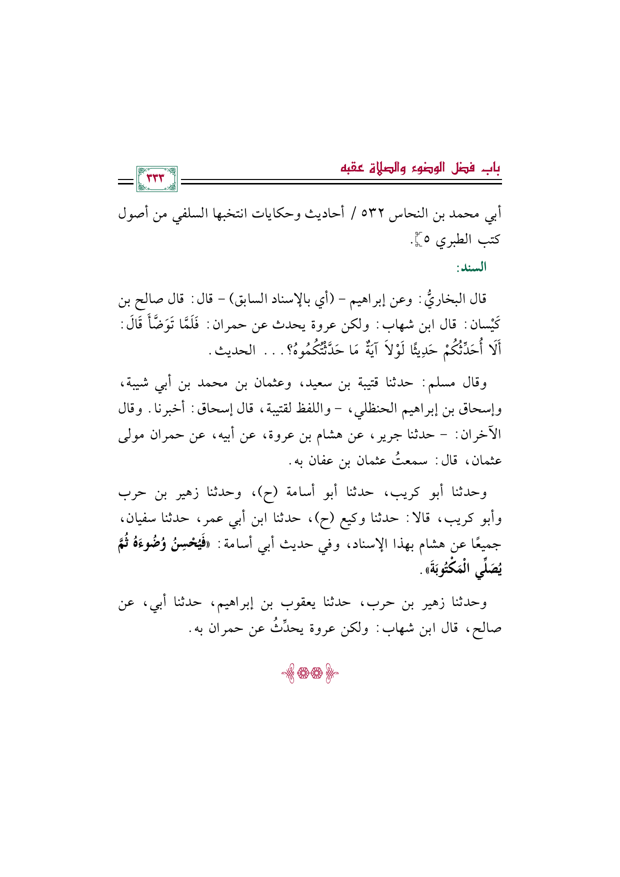 وقال مسلم: حدثنا قتيبة بن سعيد، وعثمان بن محمد بن أبي شيبة، وإسحاق بن إبراهيم الحنظلي، -واللفظ لقتيبة، قال إسحاق: أخبرنا. وقال الآخران: - حدثنا جرير، عن هشام بن عروة، عن أبيه، عن حمران مولى عثمان، قال: سمعتُ عثمان بن عفان به.