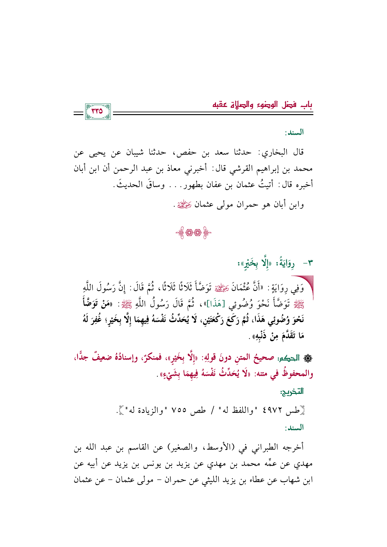 أخرجه الطبراني في (الأوسط، والصغير) عن القاسم بن عبد الله بن مهدي عن عمِّه محمد بن مهدي عن يزيد بن يونس بن يزيد عن أبيه عن ابن شهاب عن عطاء بن يزيد الليثي عن حمران -مولى عثمان- عن عثمان
