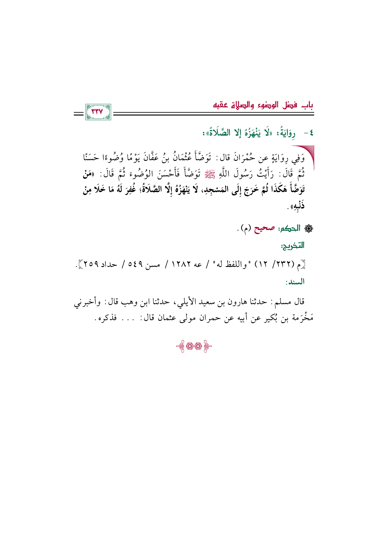 قال مسلم: حدثنا هارون بن سعيد الأيلي، حدثنا ابن وهب قال: وأخبرني مَخْرَمة بن بُكير عن أبيه عن حمران مولى عثمان قال: ... فذكره.