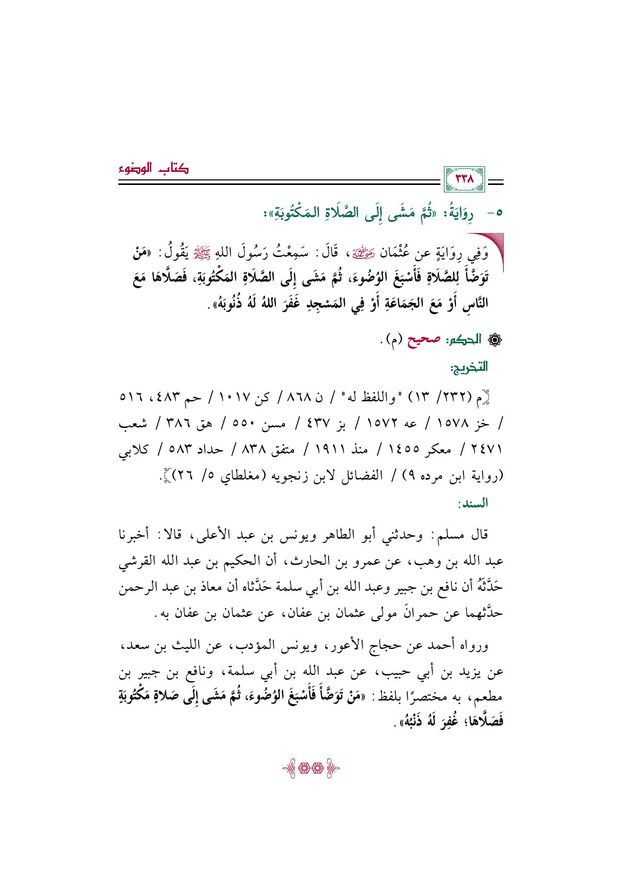 قال مسلم: وحدثني أبو الطاهر ويونس بن عبد الأعلى، قالا: أخبرنا عبد الله بن وهب، عن عمرو بن الحارث، أن الحكيم بن عبد الله القرشي حَدَّثَهُ أن نافع بن جبير وعبد الله بن أبي سلمة حَدَّثاه أن معاذ بن عبد الرحمن حدَّثهما عن حمرانَ مولى عثمان بن عفان، عن عثمان بن عفان به.
