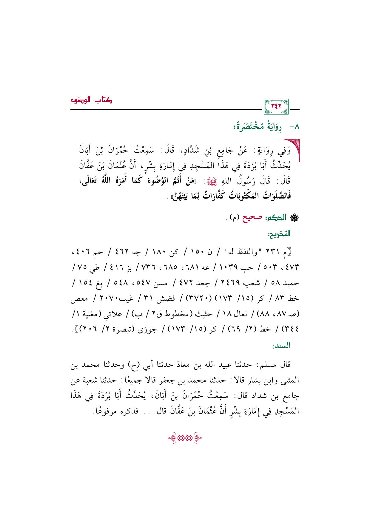 قال مسلم: حدثنا عبيد الله بن معاذ حدثنا أبي (ح) وحدثنا محمد بن المثنى وابن بشار قالا: حدثنا محمد بن جعفر قالا جميعًا: حدثنا شعبة عن جامع بن شداد قال: سَمِعْتُ حُمْرَانَ بنَ أَبَانَ، يُحَدِّثُ أَبَا بُرْدَةَ فِي هَذَا المَسْجِدِ فِي إِمَارَةِ بِشْرٍ أَنَّ عُثْمَانَ بنَ عَفَّانَ قال ... فذكره مرفوعًا.
