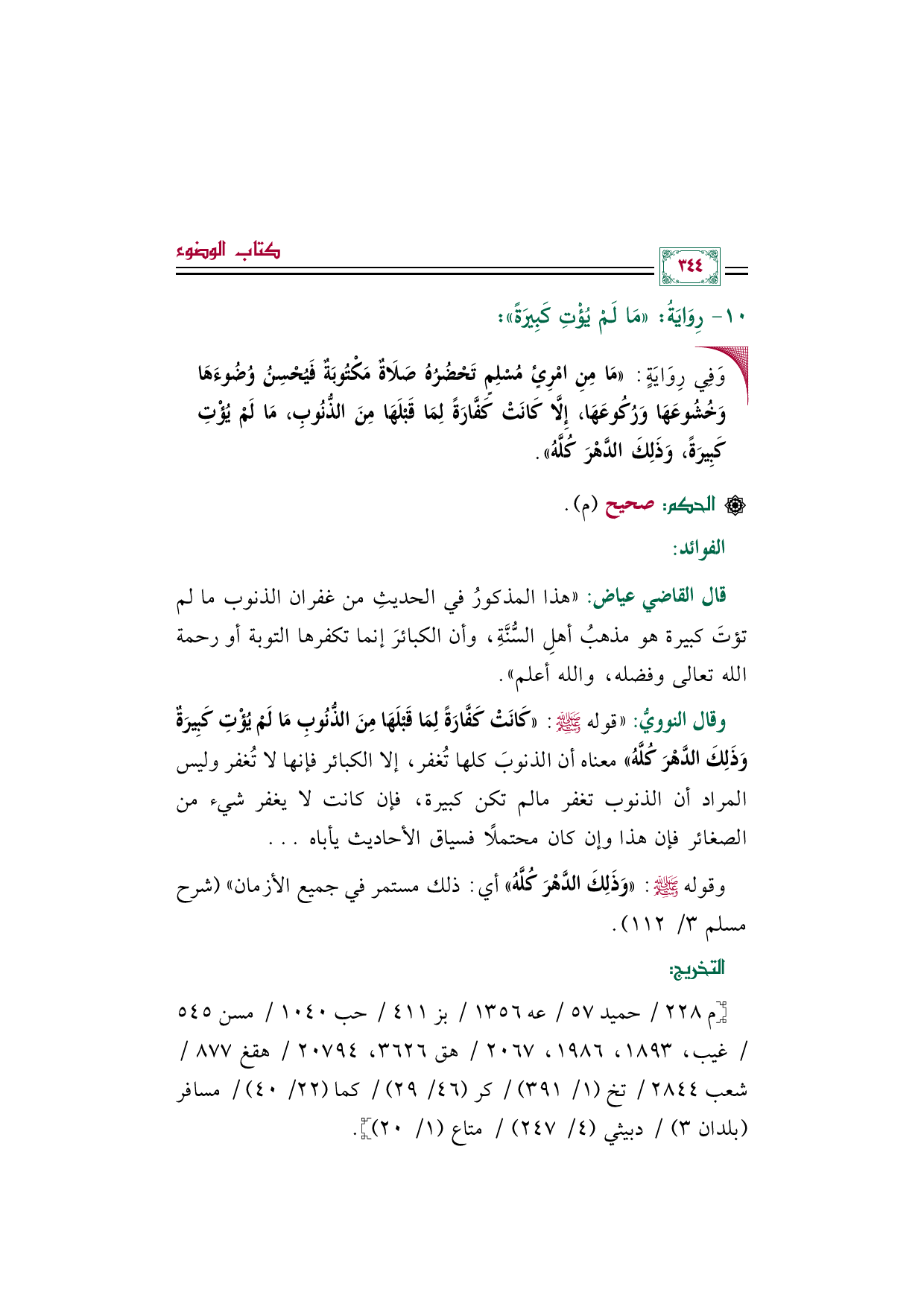 قال القاضي عياض: ((هذا المذكورُ في الحديثِ من غفران الذنوب ما لم تؤتَ كبيرة هو مذهبُ أهلِ السُّنَّةِ، وأن الكبائرَ إنما تكفرها التوبة أو رحمة الله تعالى وفضله، والله أعلم)).