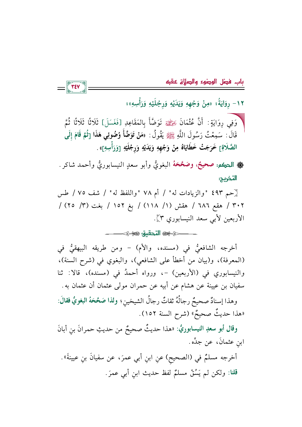 وقال أبو سعدٍ النيسابوريُّ: "هذا حديثٌ صحيحٌ من حديثِ حمرانَ بنِ أبانَ بنِ عثمانَ، عن جدِّه.