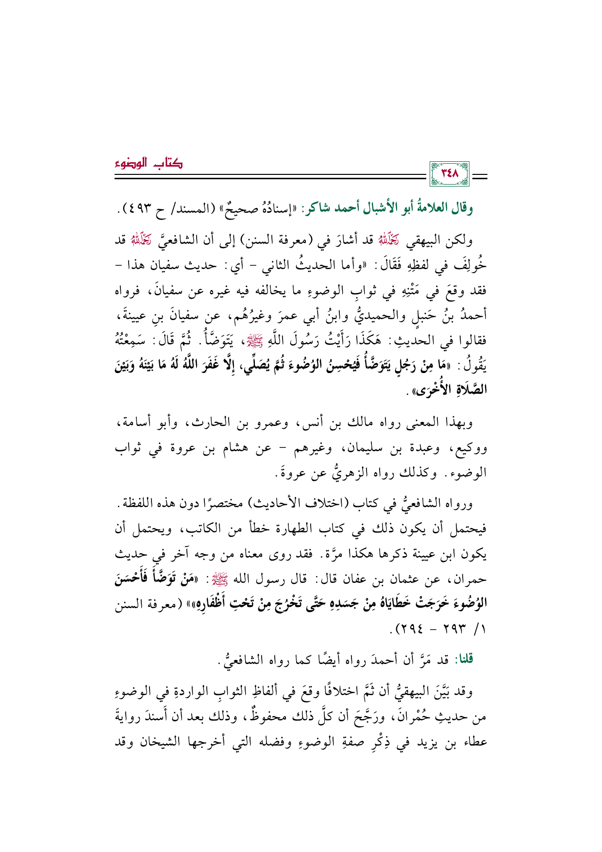 ولكن البيهقي رحمه الله قد أشارَ في (معرفة السنن) إلى أن الشافعيَّ رحمه الله قد خُولِفَ في لفظِهِ فَقَالَ: ((وأما الحديثُ الثاني -أي: حديث سفيان هذا- فقد وقعَ في مَتْنِهِ في ثوابِ الوضوءِ ما يخالفه فيه غيره عن سفيانَ، فرواه أحمدُ بنُ حَنبلٍ والحميديُّ وابنُ أبي عمرَ وغيرُهُم، عن سفيانَ بنِ عيينةَ، فقالوا في الحديثِ: هَكَذَا رَأَيْتُ رَسُولَ اللَّهِ صلى الله عليه وسلم، يَتَوَضَّأُ. ثُمَّ قَالَ: سَمِعْتُهُ يَقُولُ: «مَا مِنْ رَجُلٍ يَتَوَضَّأُ فَيُحْسِنُ الوُضُوءَ ثُمَّ يُصَلِّي، إِلَّا غَفَرَ اللَّهُ لَهُ مَا بَيْنَهُ وَبَيْنَ الصَّلَاةِ الأُخْرَى».