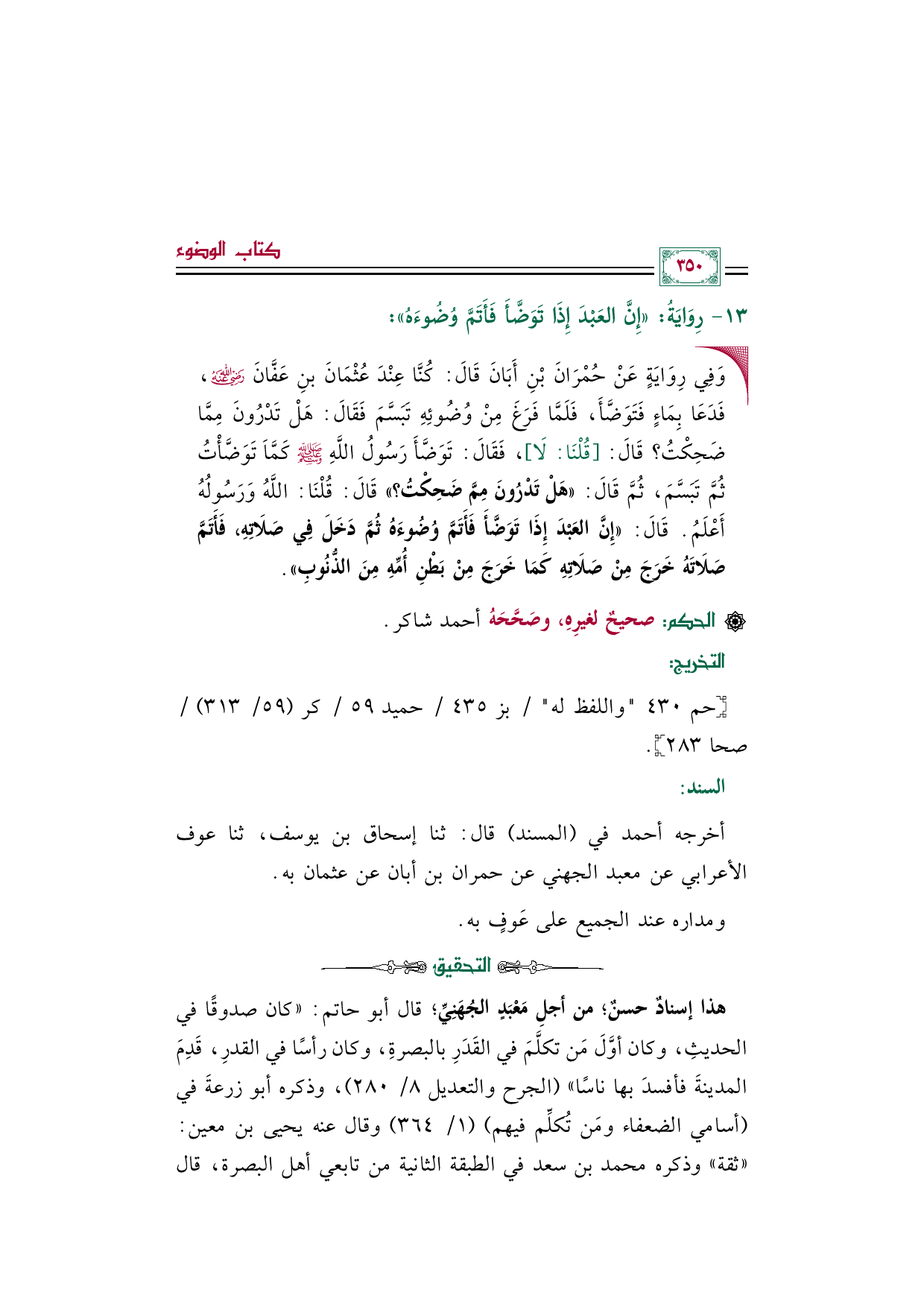 أخرجه أحمد في (المسند) قال: ثنا إسحاق بن يوسف، ثنا عوف الأعرابي عن معبد الجهني عن حمران بن أبان عن عثمان به.