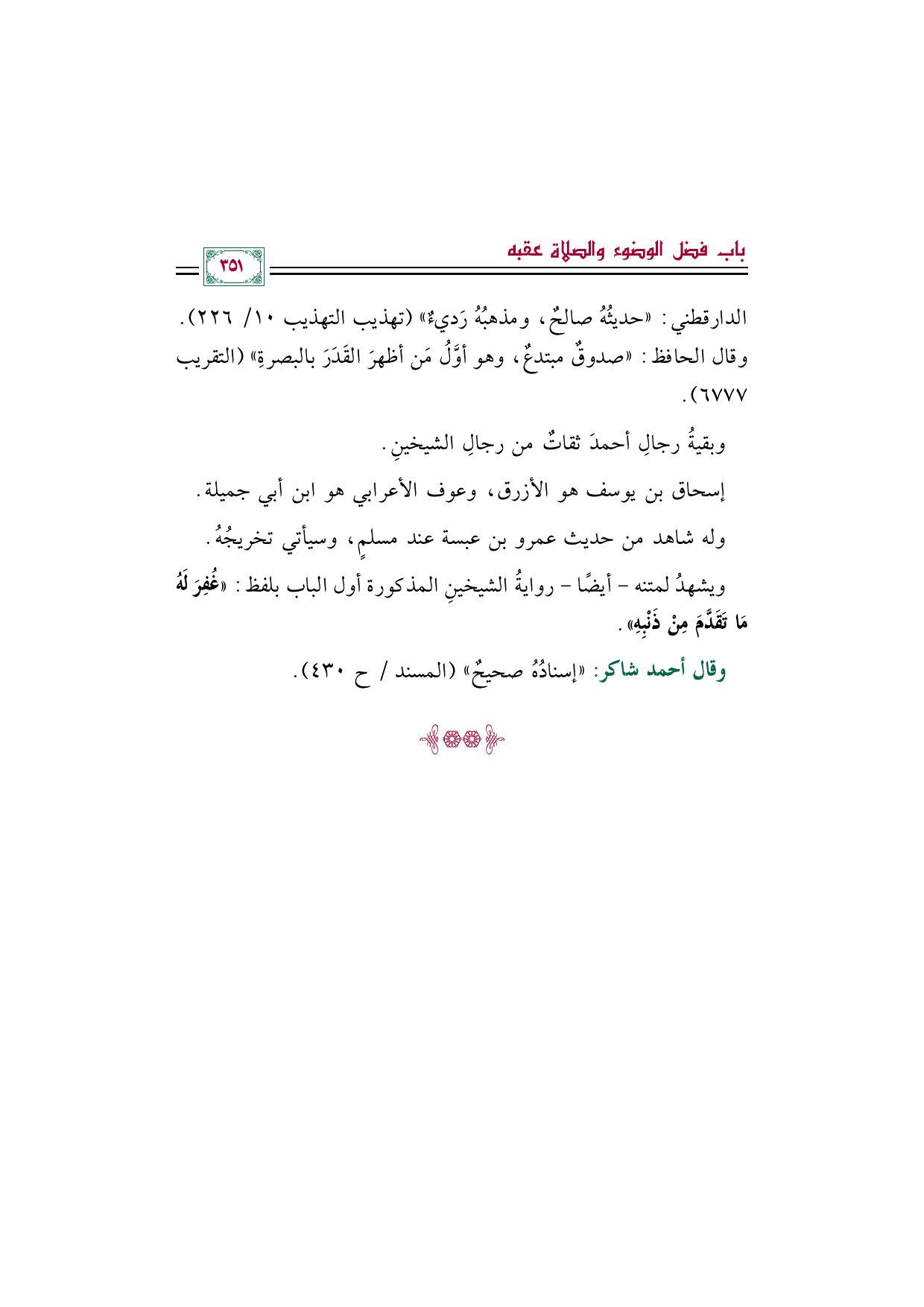 وقال أحمد شاكر: "إسنادُهُ صحيحٌ" (المسند/ ح ٤٣٠).