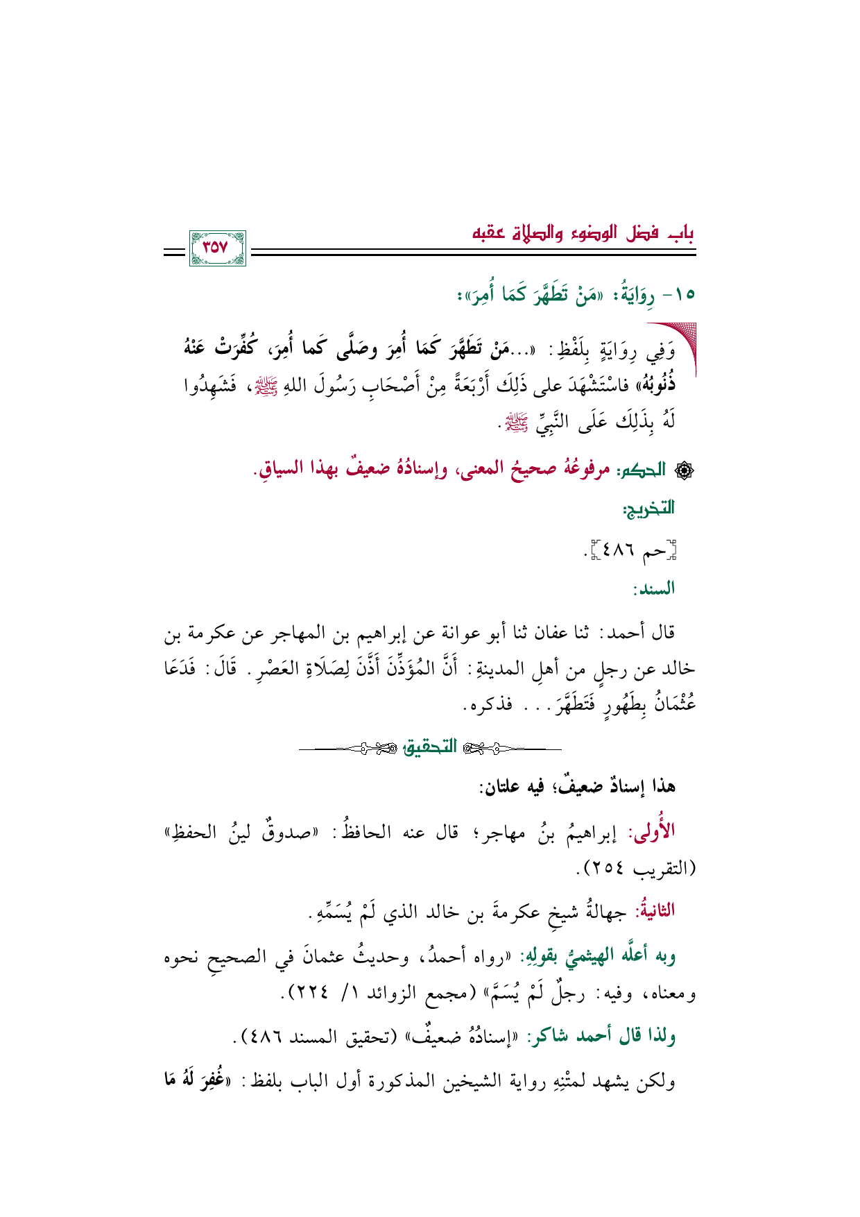 قال أحمد: ثنا عفان ثنا أبو عوانة عن إبراهيم بن المهاجر عن عكرمة بن خالد عن رجلٍ من أهلِ المدينةِ: أَنَّ المُؤَذِّنَ أَذَّنَ لِصَلَاةِ العَصْرِ. قَالَ: فَدَعَا عُثْمَانُ بِطَهُورٍ فَتَطَهَّرَ ... فذكره.