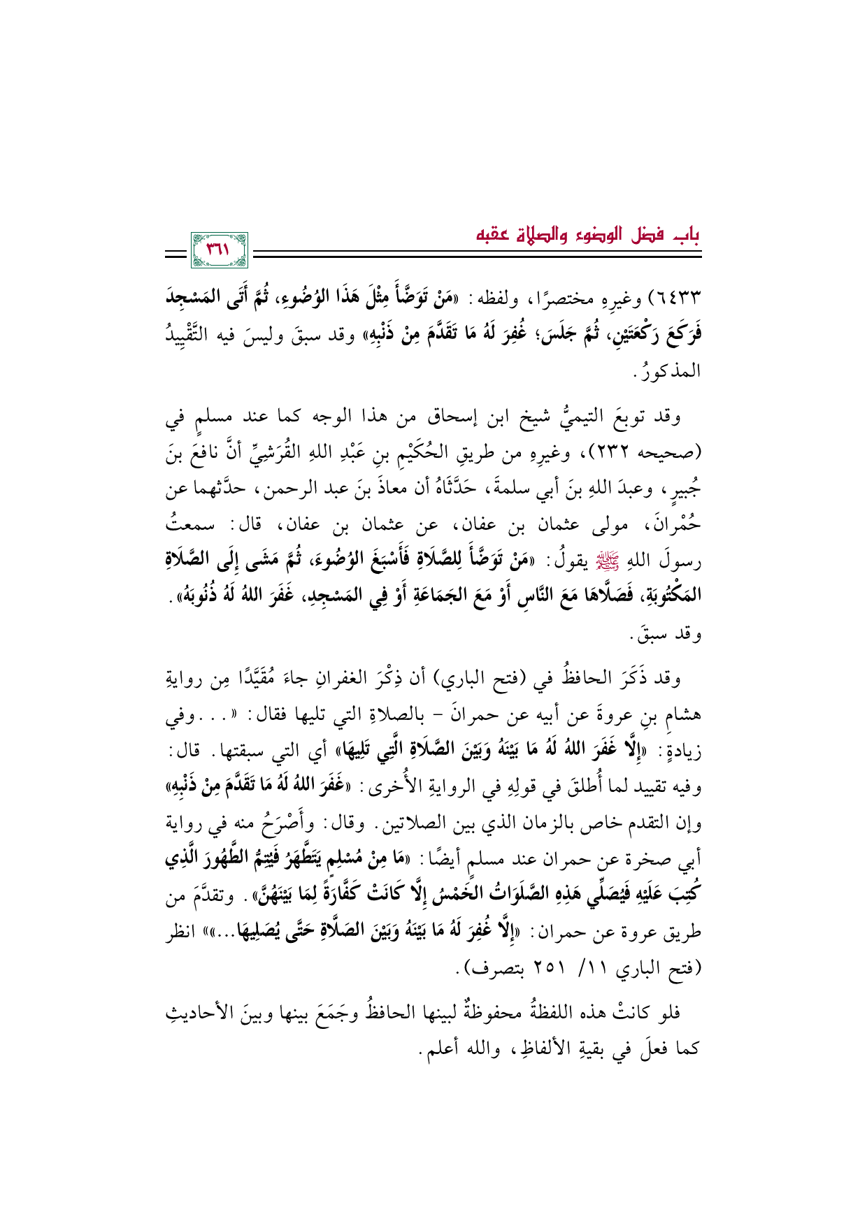 وقد ذَكَرَ الحافظُ في (فتح الباري) أن ذِكْرَ الغفرانِ جاءَ مُقَيَّدًا مِن روايةِ هشامِ بنِ عروةَ عن أبيه عن حمرانَ- بالصلاةِ التي تليها فقال: (( ... وفي زيادةٍ: «إِلَّا غَفَرَ اللهُ لَهُ مَا بَيْنَهُ وَبَيْنَ الصَّلَاةِ الَّتِي تَلِيهَا» أي التي سبقتها. قال: وفيه تقييد لما أُطلقَ في قولِهِ في الروايةِ الأُخرى: «غَفَرَ اللهُ لَهُ مَا تَقَدَّمَ مِنْ ذَنْبِهِ» وإن التقدم خاص بالزمان الذي بين الصلاتين. وقال: وأَصْرَحُ منه في رواية أبي صخرة عن حمران عند مسلمٍ أيضًا: «مَا مِنْ مُسْلِمٍ يَتَطَّهَرُ فَيُتِمُّ الطَّهُورَ الَّذِي كُتِبَ عَلَيْهِ فَيُصَلِّي هَذِهِ الصَّلَوَاتُ الخَمْسُ إِلَّا كَانَتْ كَفَّارَةً لِمَا بَيْنَهُنَّ». وتقدَّمَ من طريق عروة عن حمران: «إِلَّا غُفِرَ لَهُ مَا بَيْنَهُ وَبَيْنَ الصَلَّاةِ حَتَّى يُصَلِيهَا ... »)) انظر (فتح الباري ١١/ ٢٥١ بتصرف).